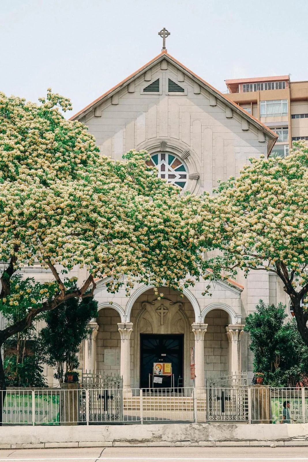 在這座古典教堂門外,有多棵魚木花樹,魚木花盛放力上羅馬式教堂背景,令人打卡打到手軟!