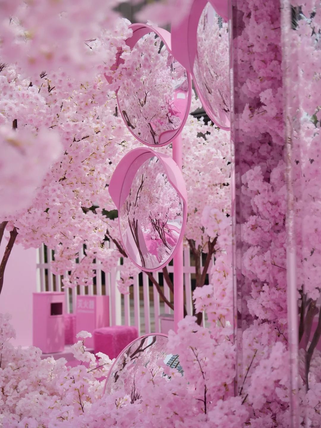 電話亭頗創意,鏡面電話亭內以滿滿的櫻花布置,內有一個粉紅色的古董電話