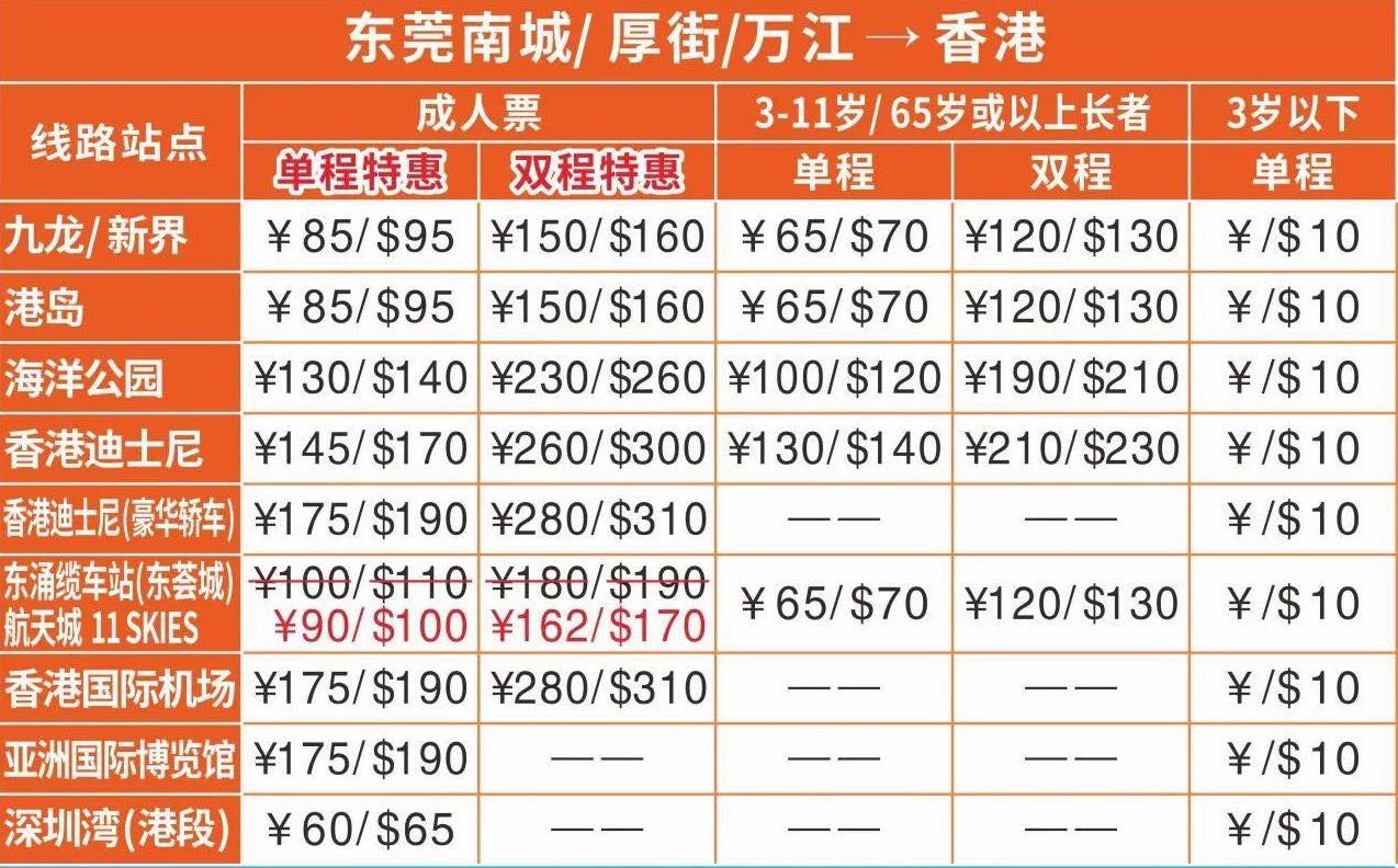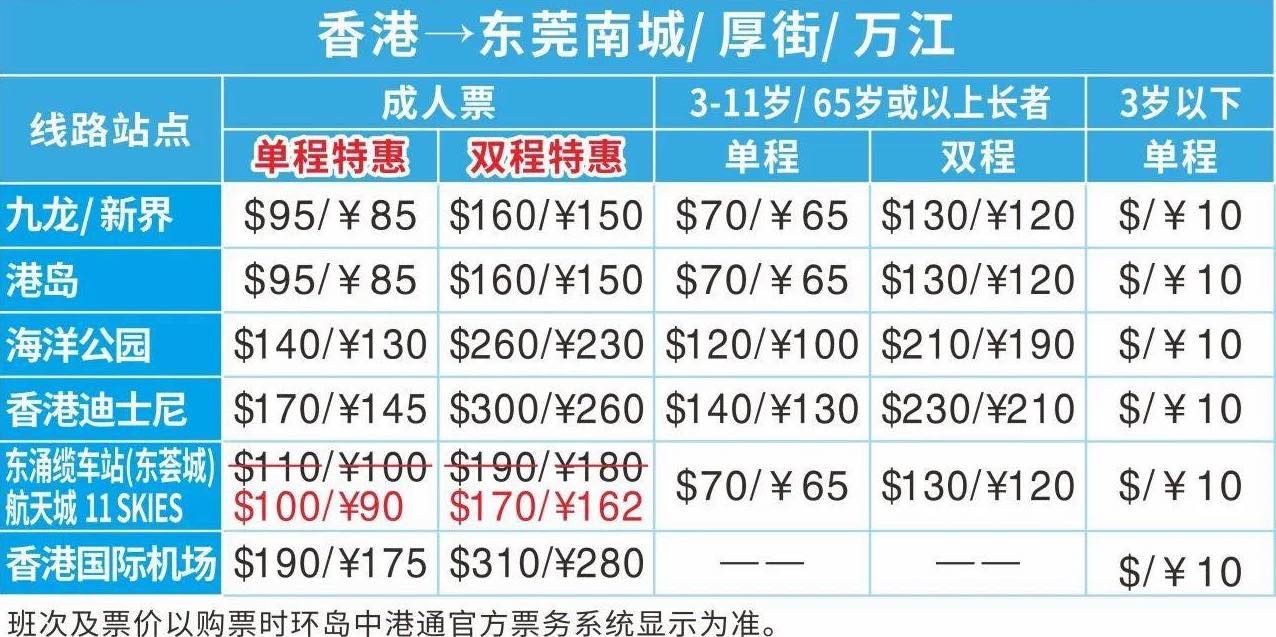🎫  票價(東莞⮕香港,長者及小童享優惠票價)