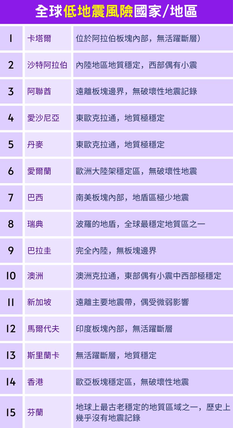 ✅ 遠離主要地震帶(環太平洋帶、歐亞地震帶等)
