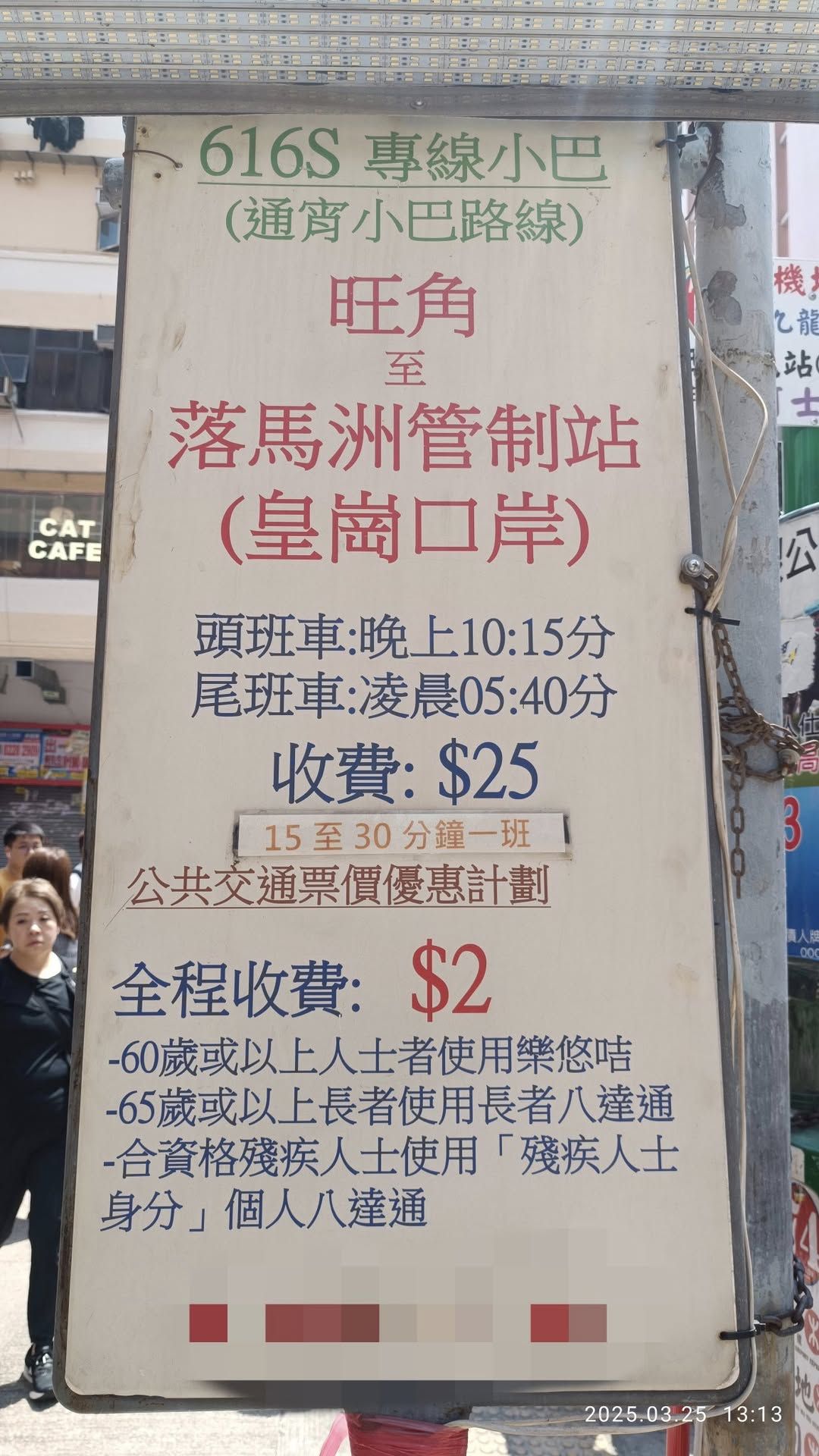,通宵營運,長者北上夜歸回港想出市區乘搭都算方便。皇崗口岸24小時開放,當然深夜後想搭這小巴北上也可以,用「長者2元乘車優惠」慳足$23。
