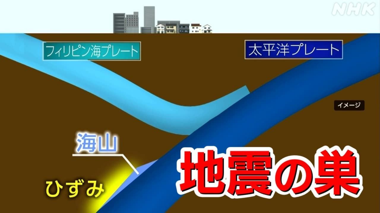 4️⃣ 這些「海底山」排列密集,或因為沉入板塊而積累「應力」,仿如「地震巢穴」(「地震の巣」)引發頻繁地震⚠️
