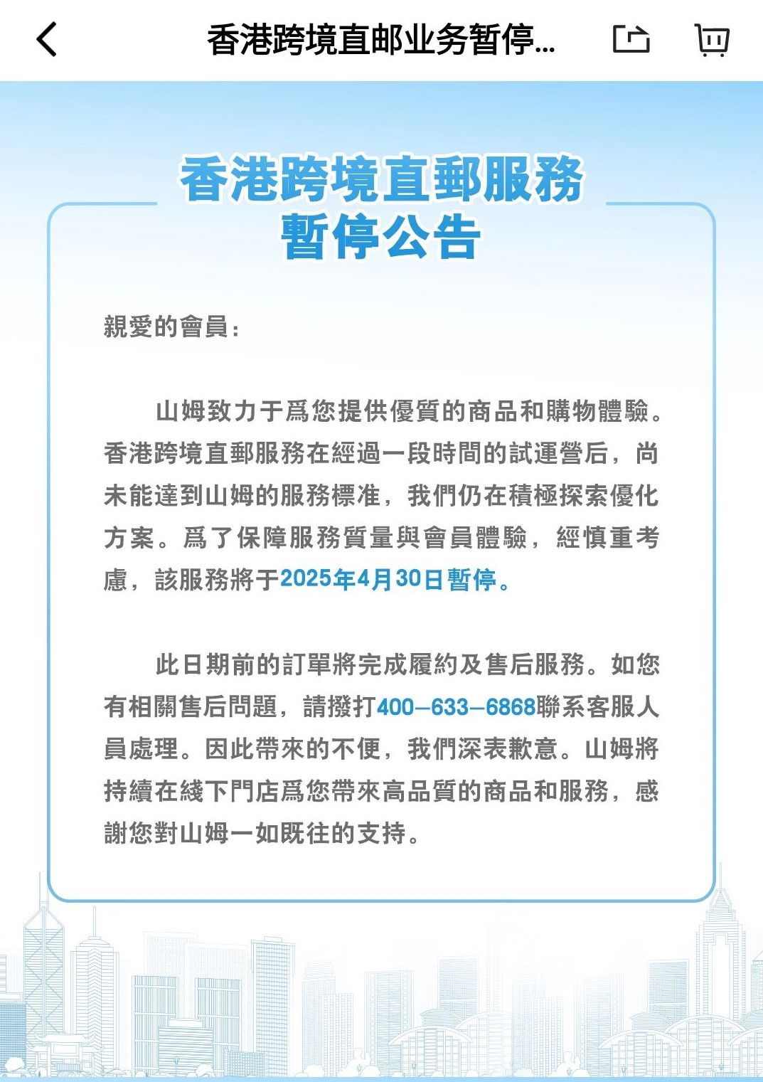 有網民「Costco山姆開心share」Facebook 群組內出帖發現山姆會員商店的香港跨境直郵服務暫停服務,該公告表示服務將於4月30日暫停。山姆表示:「香港跨境直郵服務經過一段時間的試運營後,尚未能達到山姆的服務標準」,所以決定暫停。