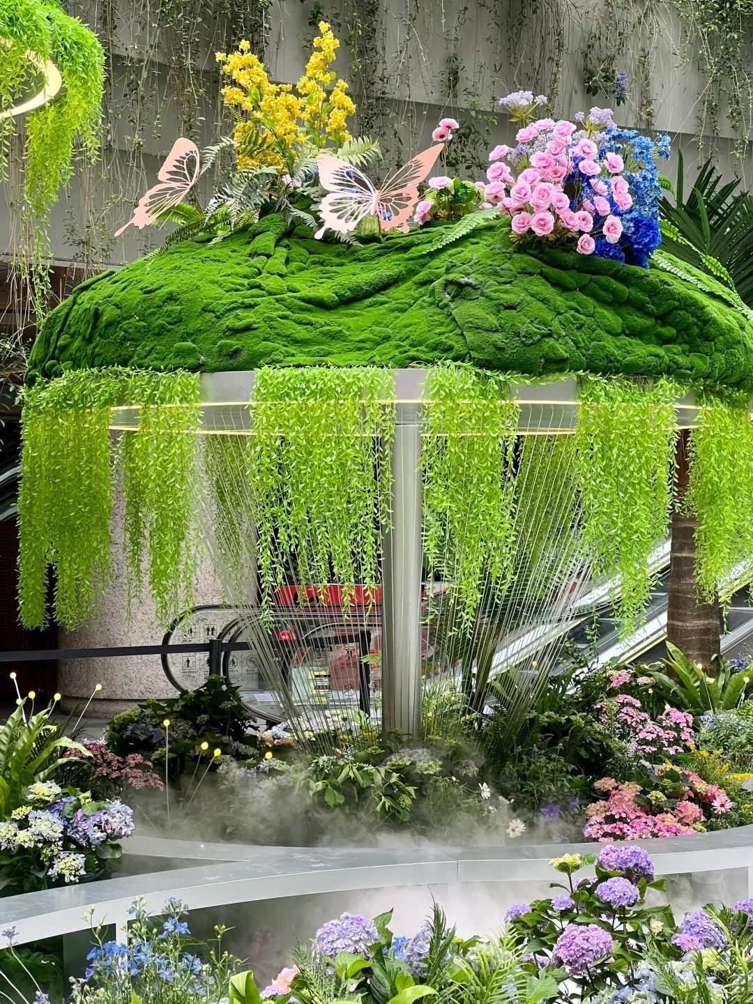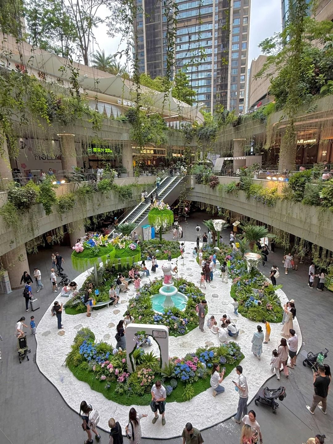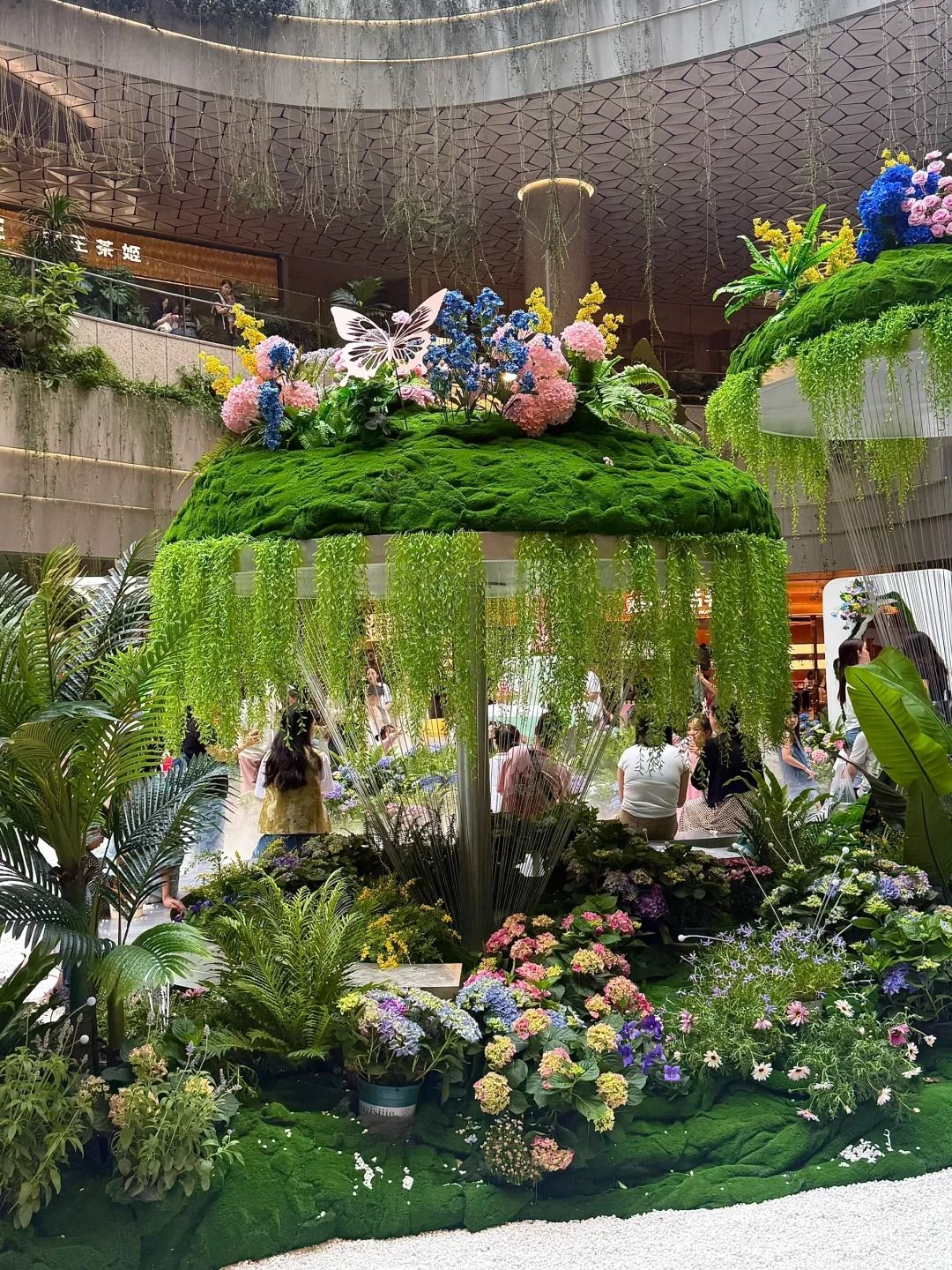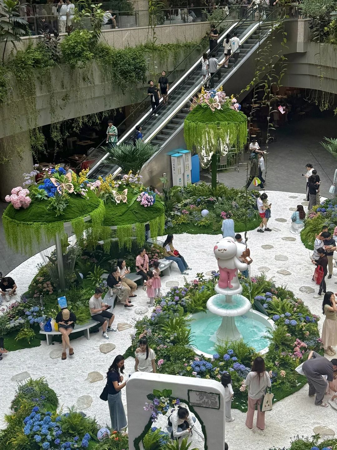 商場中庭裝置以 「綠野仙踪」 為主題,把 B1 層的中庭變成像新加坡植物園,設有噴水泉、苔蘚長春藤涼亭,周圍更種植了不少花卉,有網民回報更用上 真繡球花,亦不時有夢幻泡泡時段登場,作為商場免費打卡地點,好有誠意。