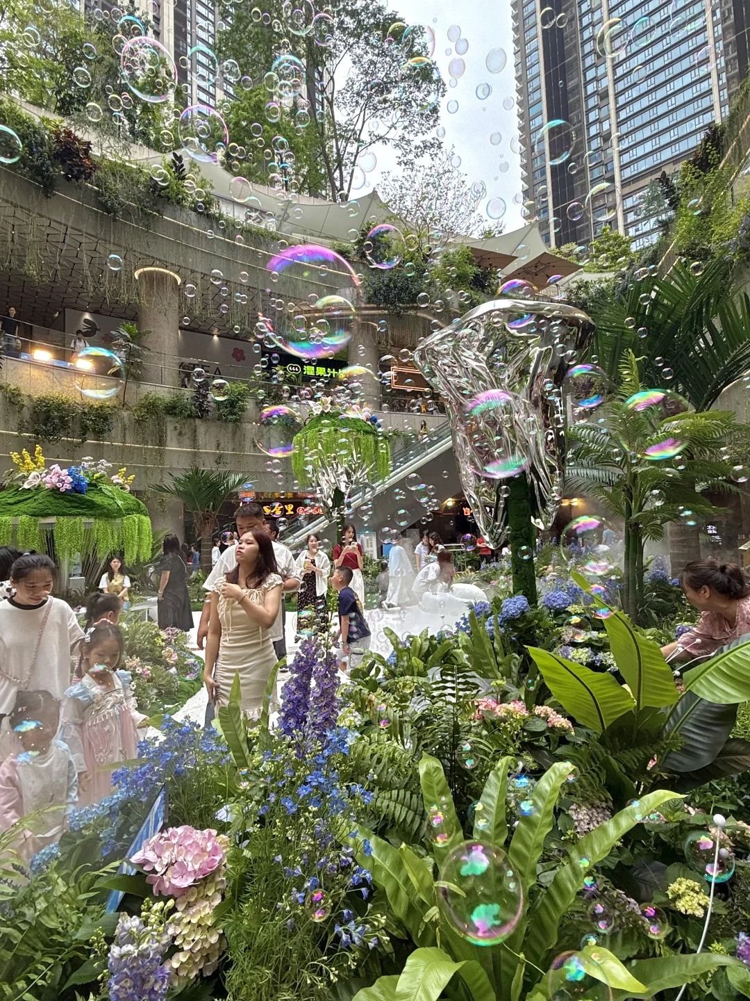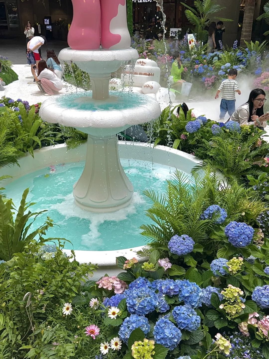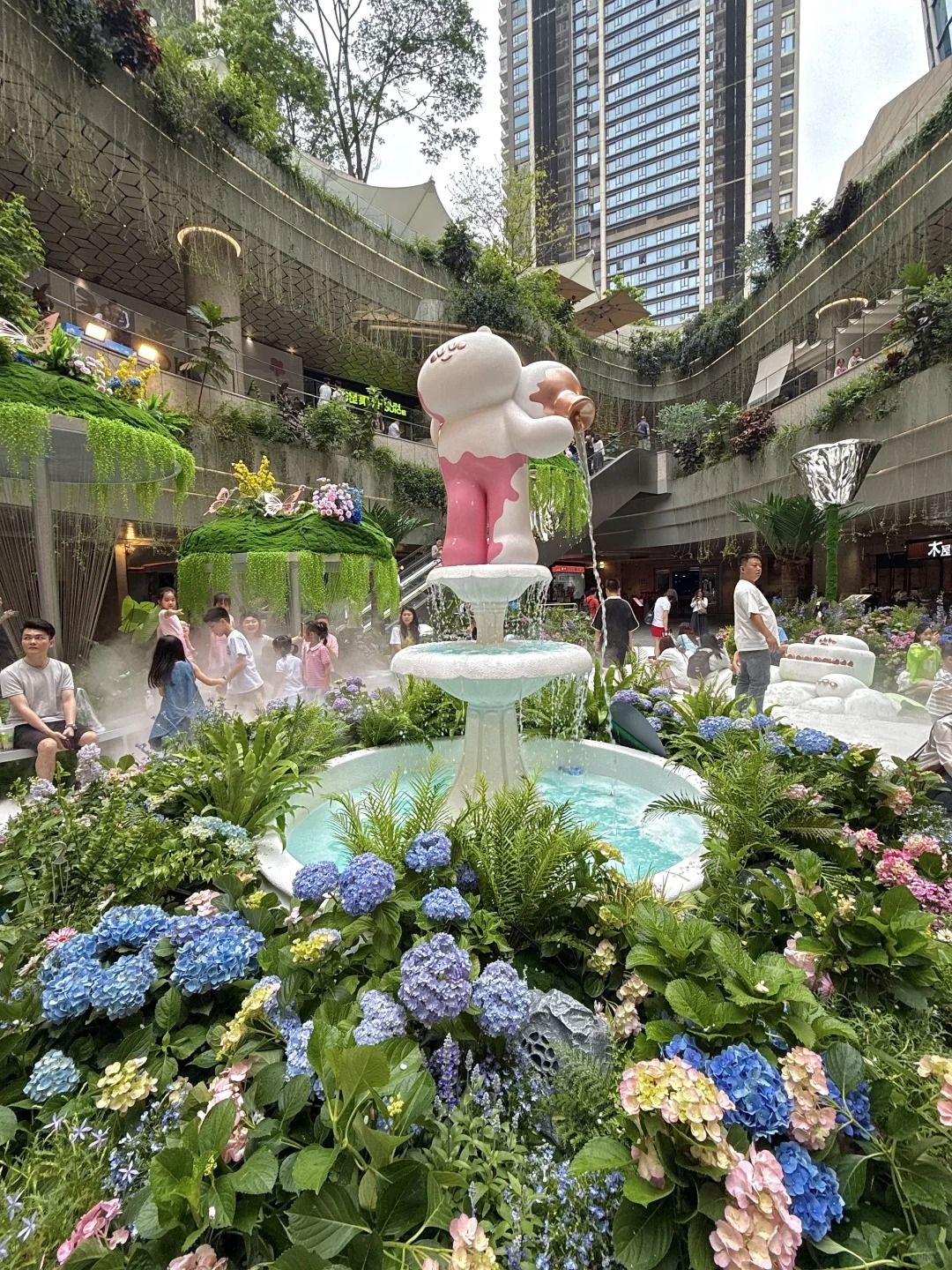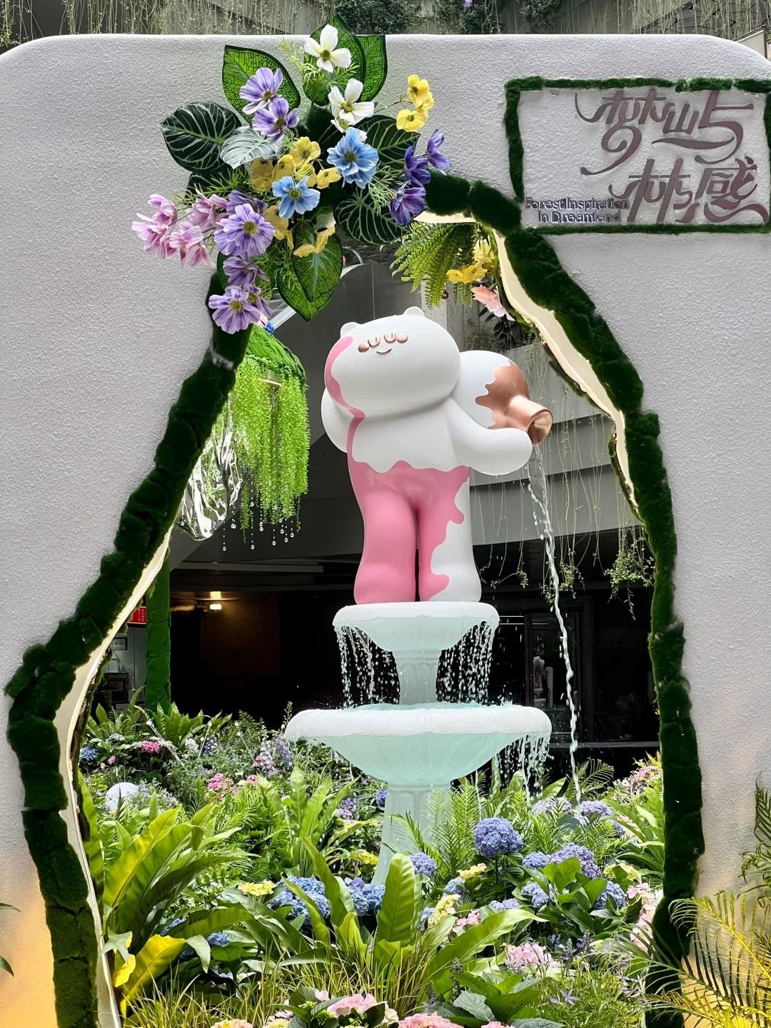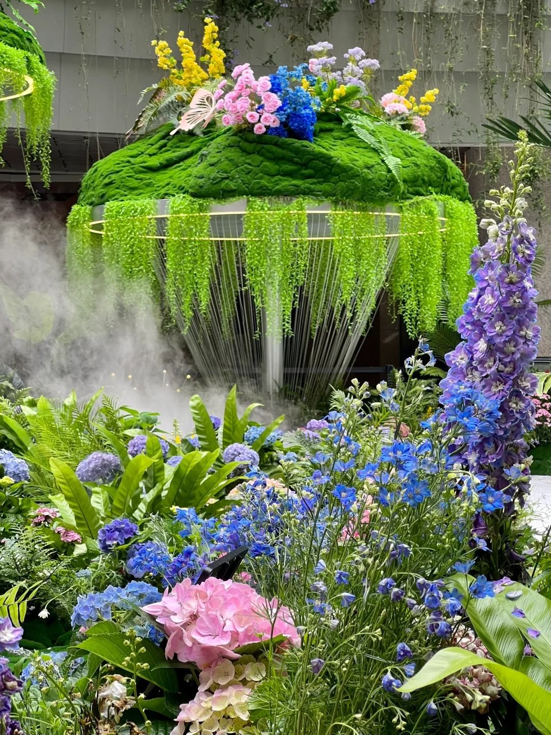 商場中庭裝置以 「綠野仙踪」 為主題,把 B1 層的中庭變成像新加坡植物園,設有噴水泉、苔蘚長春藤涼亭,周圍更種植了不少花卉,有網民回報更用上 真繡球花,亦不時有夢幻泡泡時段登場,作為商場免費打卡地點,好有誠意。