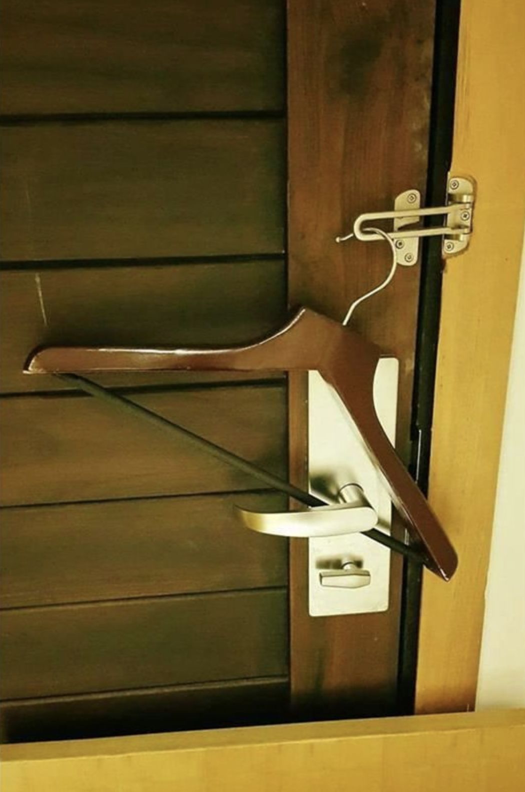 8️⃣ 💤睡覺前鎖門及用櫈子頂着門|睡覺前確保房門鎖上、防盜鍊也扣上,想加強警覺性,可把個衣架(要木材質的)一個掛在門上、另一邊扣著防盜鏈,外面的人便無法打門房問;或用櫈子把門頂着,若有人開門,便會發出聲響。