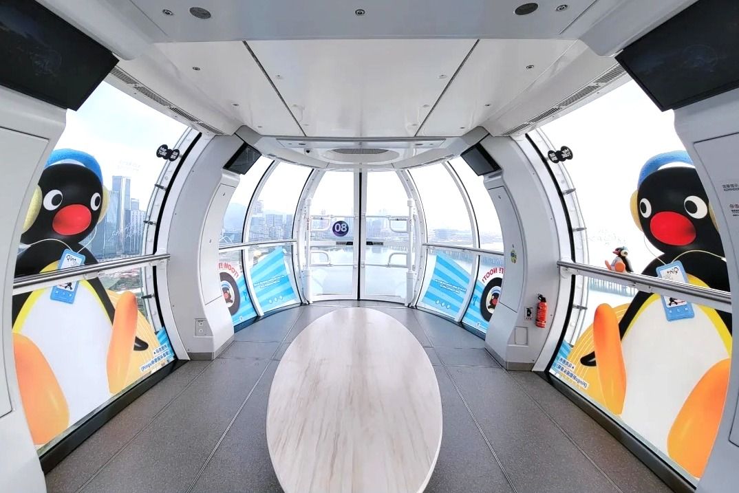 摩天輪🎡的 1、8、15 及 22 號車廂會加上 Pingu 裝飾🐧,港人可以在128米的摩天輪車廂中觀看360度前海灣海景。