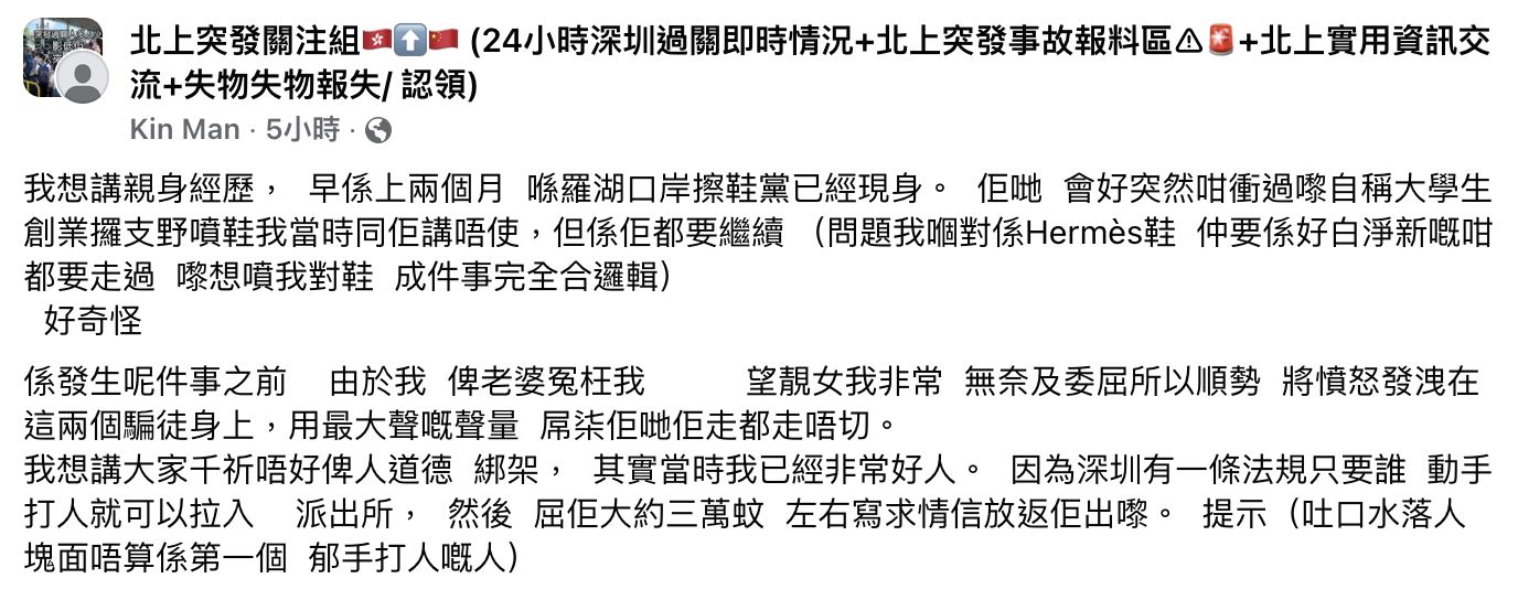 有網民在「北上突發關注組🇭🇰⬆️🇨🇳 (24小時深圳過關即時情況+北上突發事故報料區⚠️🚨+北上實用資訊交流+失物失物報失/ 認領)」Facebook群組中發帖文表示自己2個月前曾與太太在羅湖口岸遇到自稱大學生「擦鞋黨」強行想為網民太太擦鞋,最終網民憤怒,大聲叱責兩個騙徒後最終敗走。網民更提醒港人遇這情況勿動手,以防犯法惹官非。
