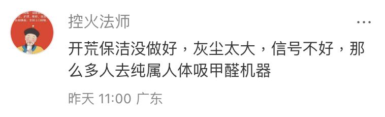 💬「開荒保潔沒做好,灰塵太大 🏗️💨,信號不好 📵,那麼多人去純屬人體吸甲醛機器 😷」
