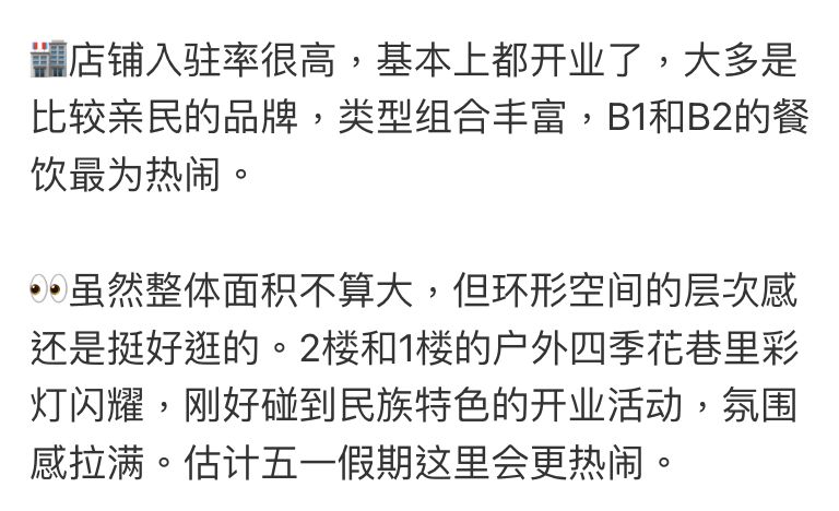 💬「店鋪入駐率很高,基本上都開業了 🏪,大多是比較親民的品牌,類型組合豐富,B1和B2的餐飲最為熱鬧 🍜🍲。」