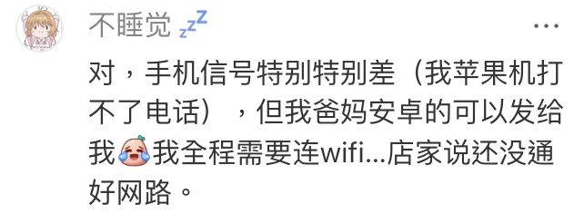 💬「對,手機信號特別特別差(我蘋果機打不了電話 📱❌),但我爸媽安卓的可以發給我,我全程需要連WiFi…店家說還沒通好網路 📶」