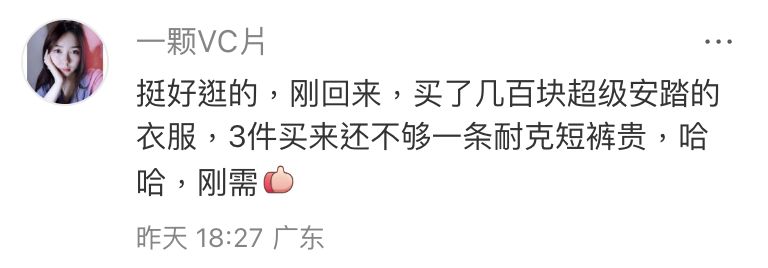 💬「挺好逛的,剛回來,買了幾百塊超級安踏的衣服 👕👟,3件買來還不夠一條耐克短褲貴,哈哈 😆,剛需」