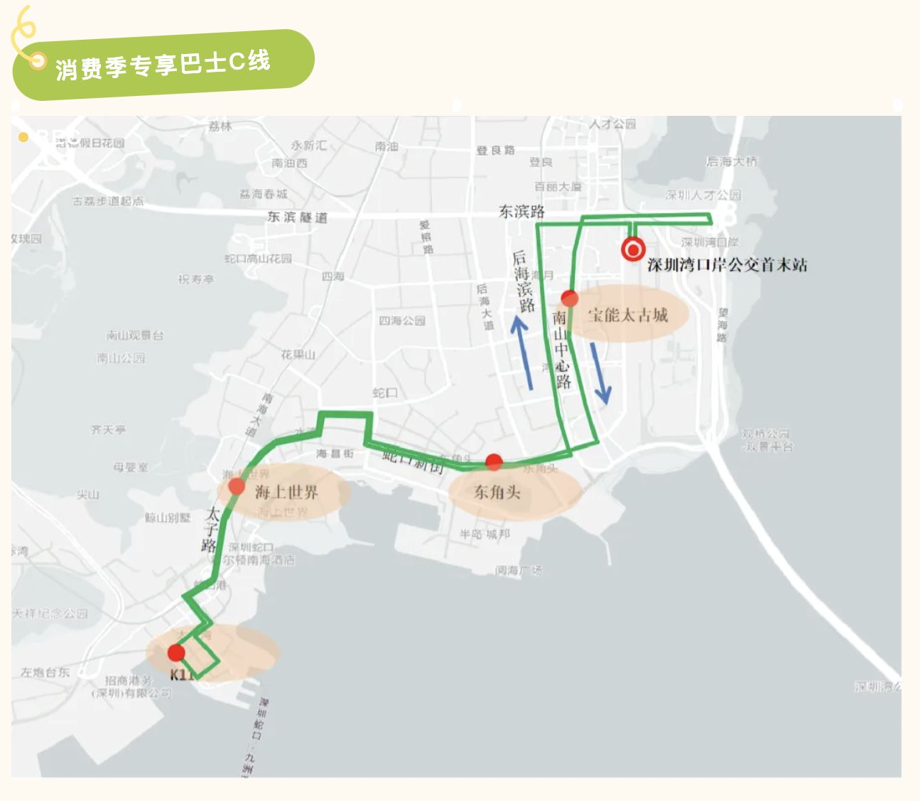🎨巴士路線延伸至蛇口,覆蓋海上世界、K11藝術中心等濱海地標,當中包括郵輪碼頭及太子灣最新地標K11 ECOAST