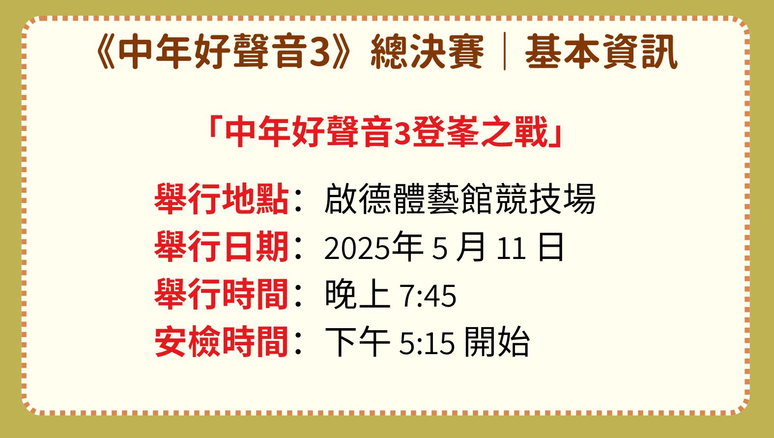 【中年好聲音3/中年好聲音3登峯之戰/中年好聲音3總決賽/中3/啟德體藝館/入場須知】《中年好聲音系列》第三季《中年好聲音3》人氣強勁,7強更於上周末節目中誕生,殺入總決賽《中年好聲音3登峯之戰》。