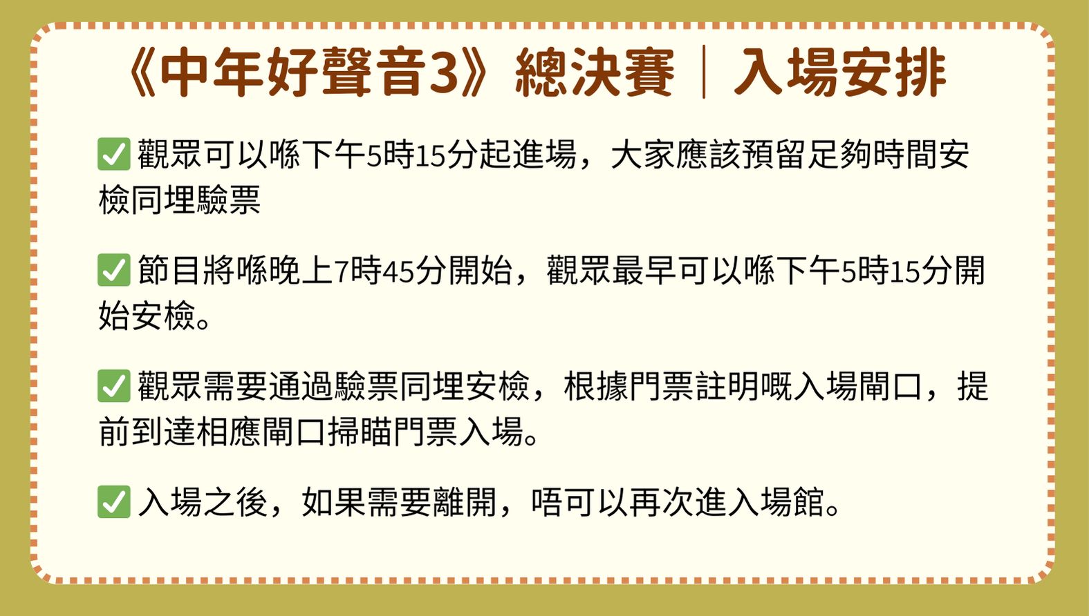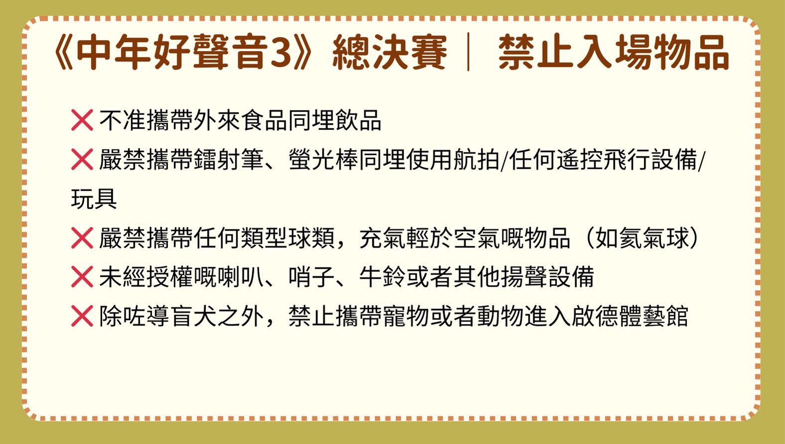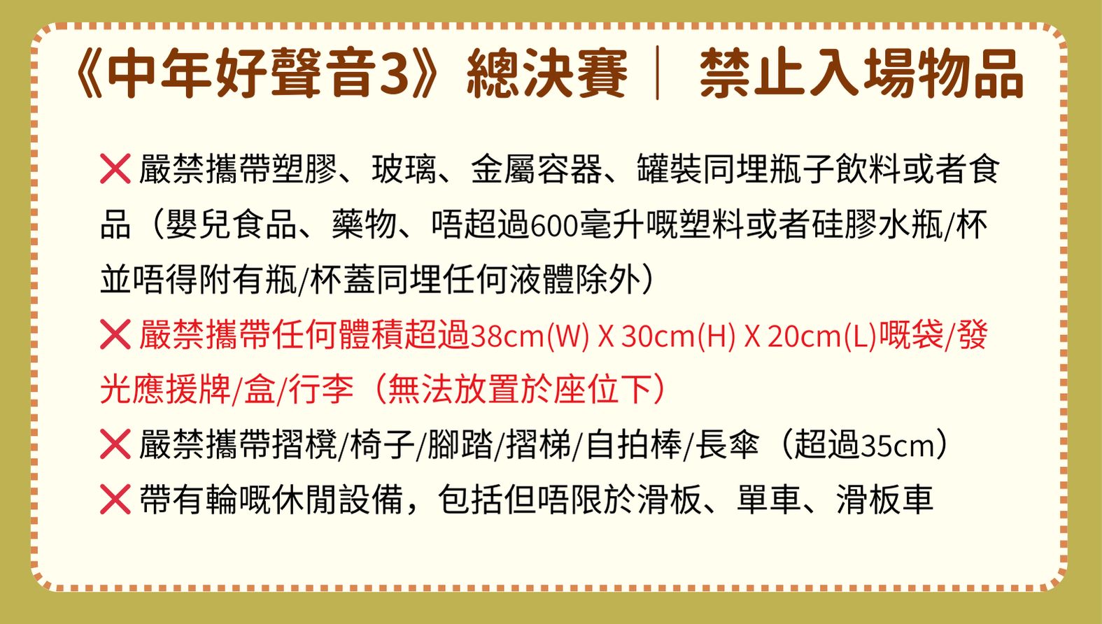 《中年好聲音3》總決賽| 禁止入場物品+應援物尺寸限制