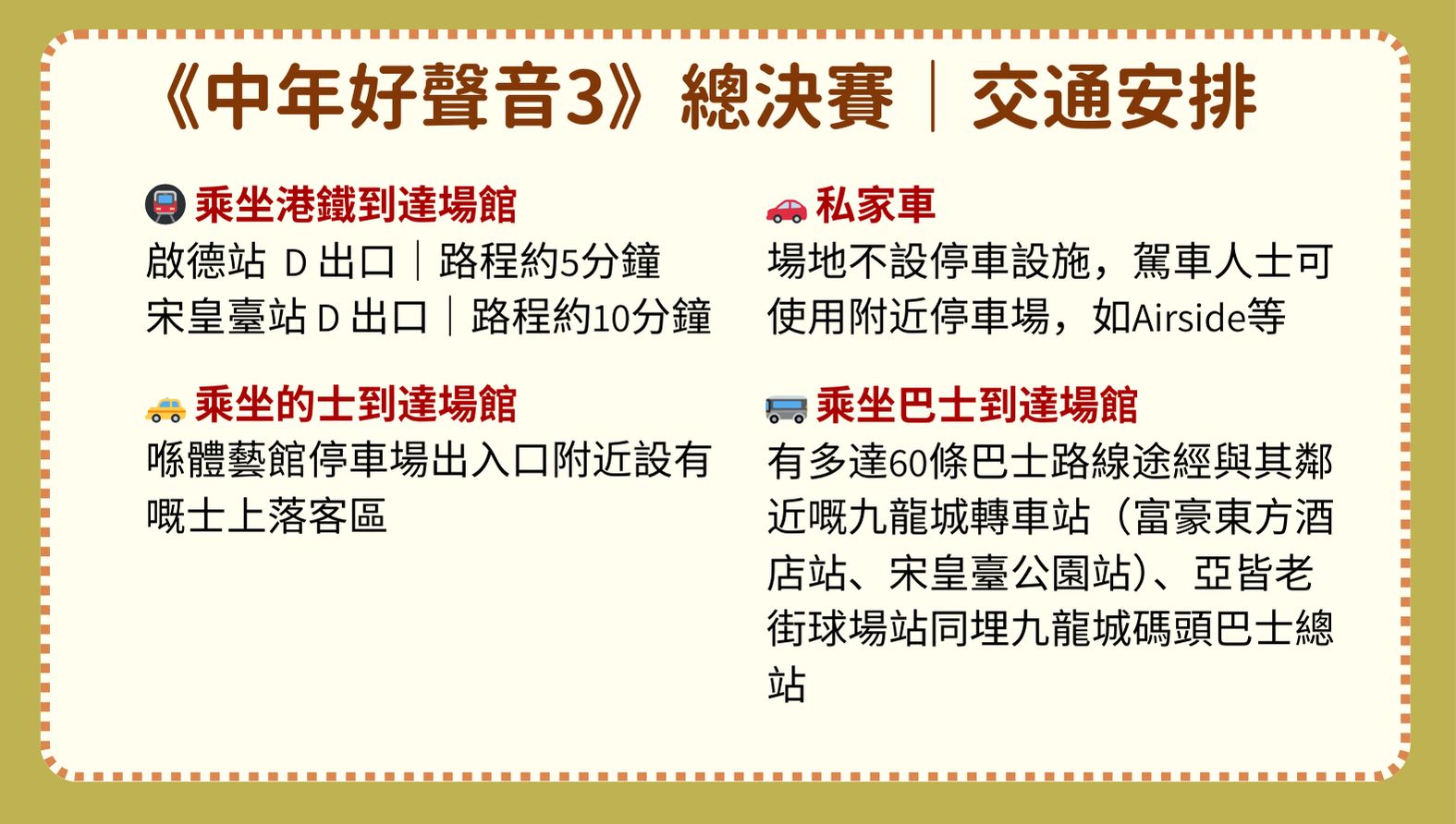 決賽將會本周日(5月11日)於啟德體藝館舉行,屆時近萬名觀眾及火fans將會見證《中年好聲音3》誕生,如果你持有門票,就要留意以下的入場規則、交通安排及禁止入場物品名單,文中仲有7強名單及歌單。