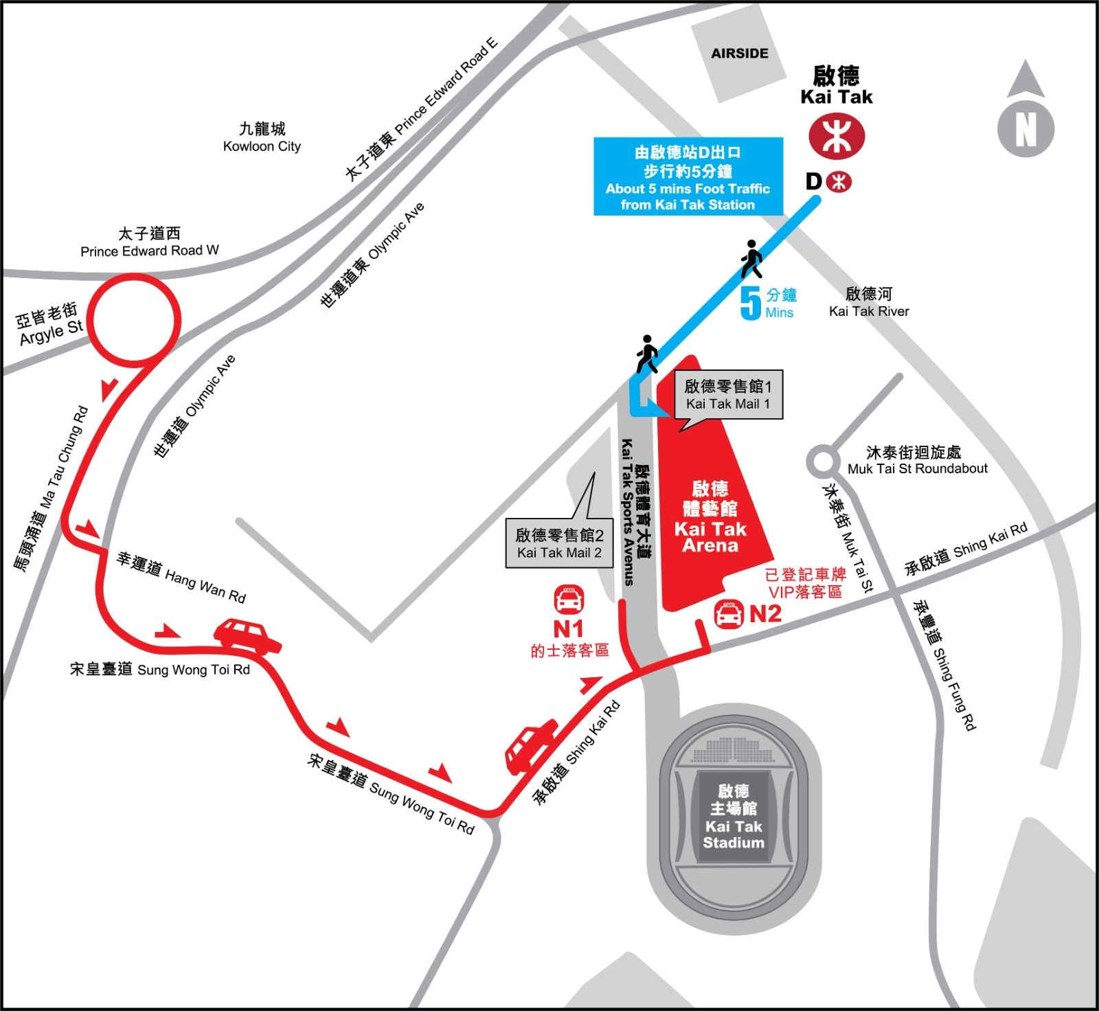 場地不設停車設施,駕車人士可使用附近停車場,如Airside等