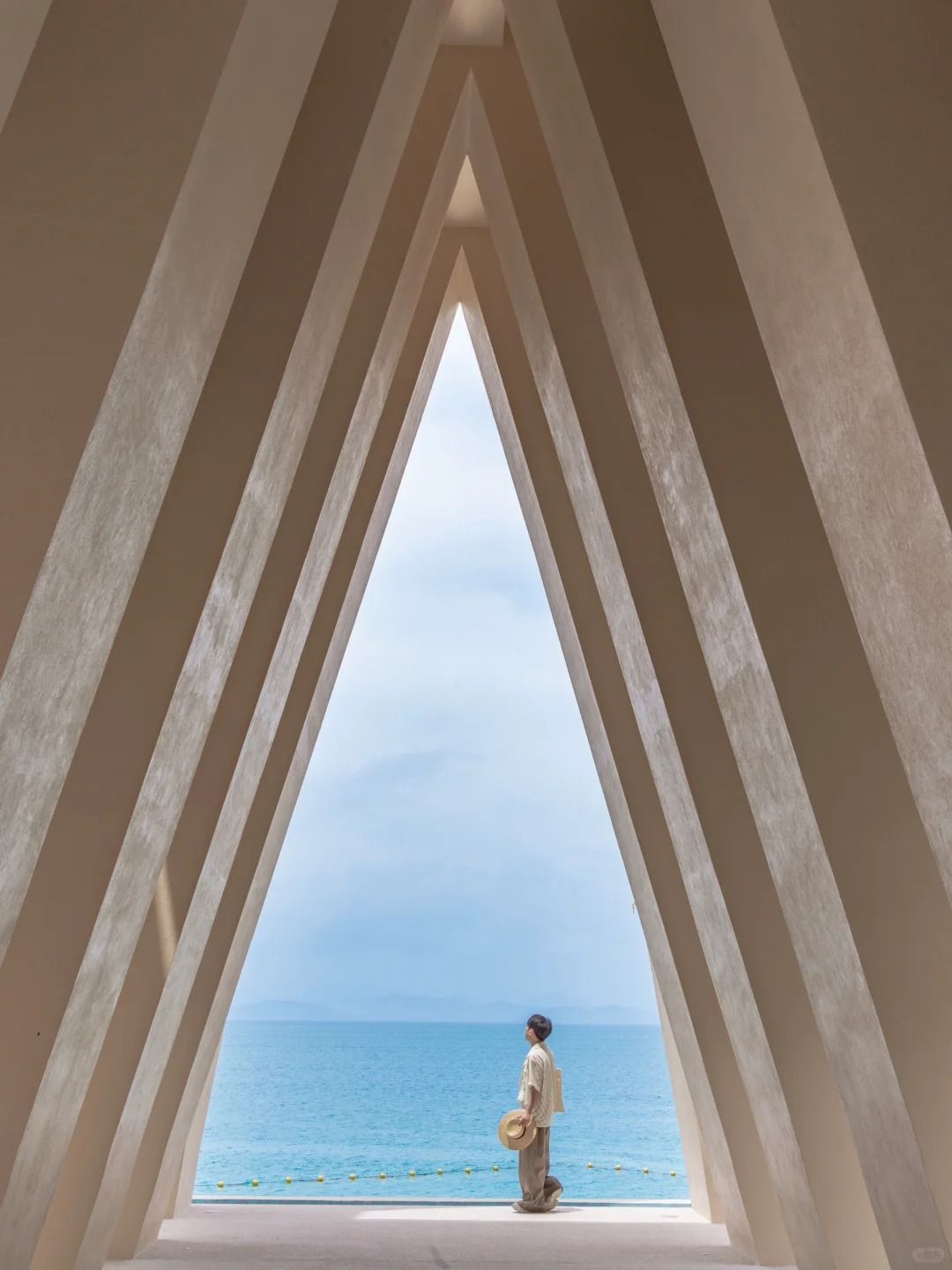 🏛️超型外觀|外型是一個直角三角型,配上暖色外牆,屹立在「玻璃海」旁更覺有型,而內部則玩光影,其中室內的三角禮堂,勁有日本大師安藤忠雄風格。