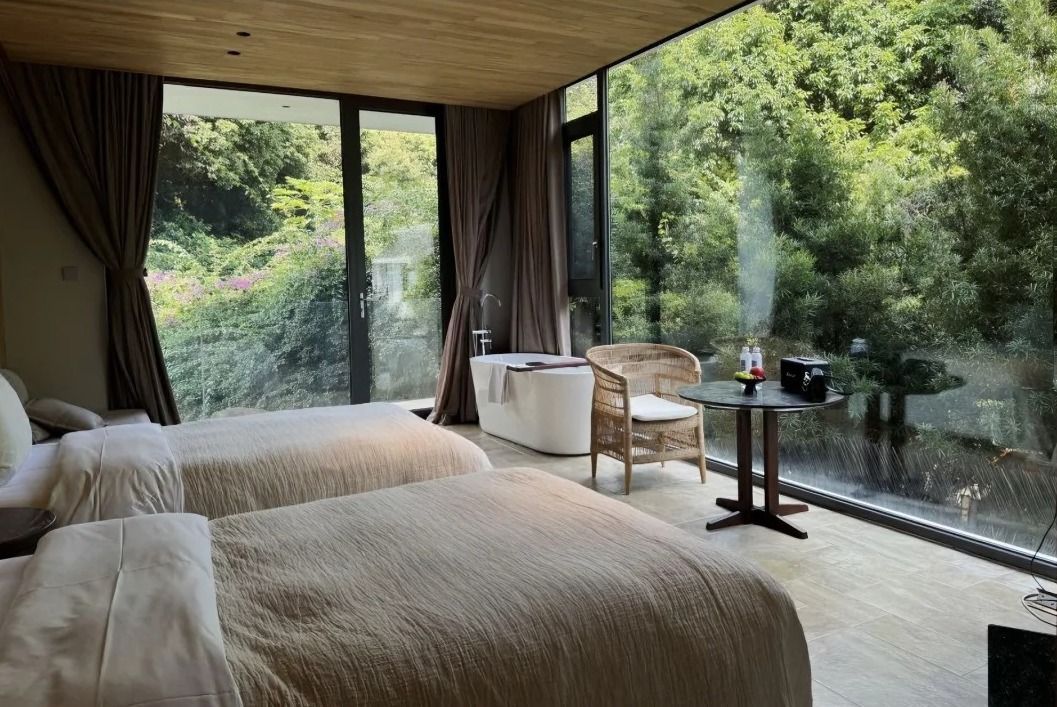 1️⃣ 漱石・山景大床房(約45㎡)|面向蒼翠山林,房內設有獨立浴缸及休憩區。