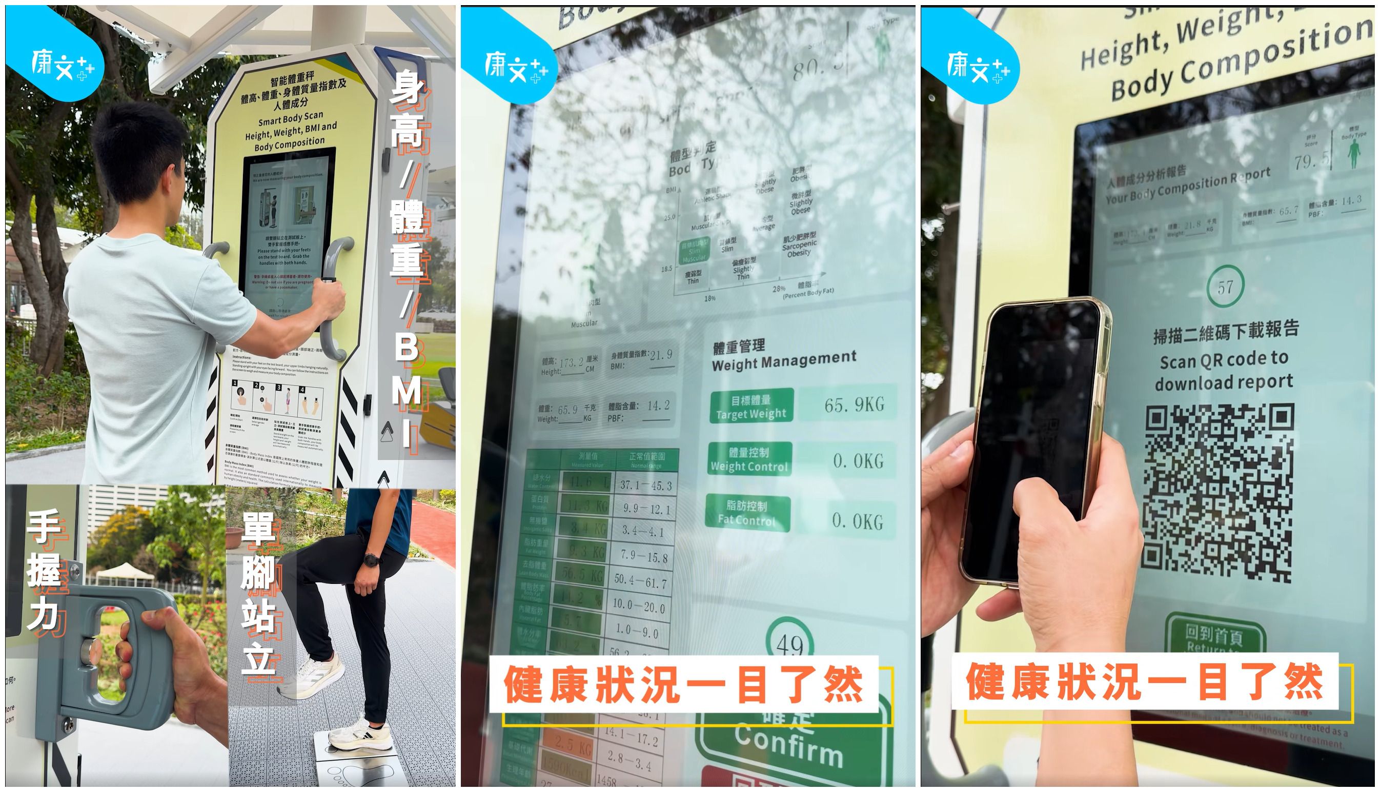 健身區設有智能測量站,免費開放給市民使用,機器可檢測多項身體指標檢測協助市民輕鬆監測健康狀況。檢測項目包括以下幾項。
