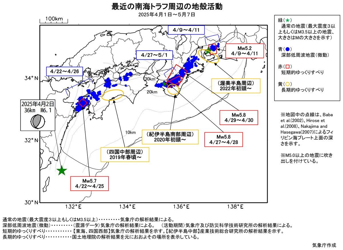 【日本地震/日本南海海槽巨大地震/日本氣象廳/地震預測/地殻變動】2025年1月,日本政府地震調查委員會將「日本南海海槽巨大地震」未來30年內發生8至9級大地震的概率升至最高82%,加上日本漫畫《我所看見的未來》表示2025年7月5日日本將發生大災難,不禁令人聯想「日本南海海槽巨大地震」會發生。日本氣象廳於5月9日發表對於「日本南海海槽巨大地震」有關海槽周邊地殻活動的最新觀察報告。