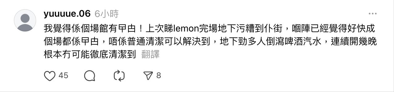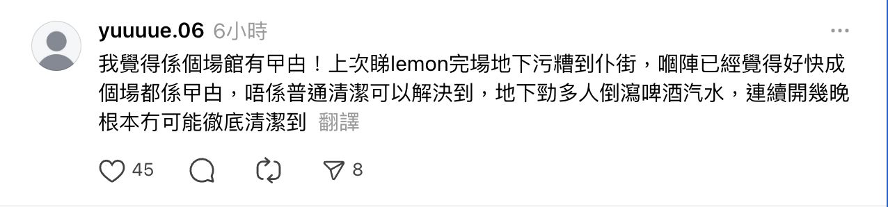 💬「我覺得係個場館有曱甴!上次睇lemon完場地下污糟到仆街,嗰陣已經覺得好快成個場都係曱由,唔係普通清潔可以解決到,地下勁多人倒瀉啤酒汽水,連續開幾晚根本冇可能徹底清潔到」