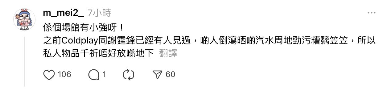 💬「係個場館有小強呀!之前Coldplay同謝霆鋒已經有人見過,啲人倒瀉晒啲汽水周地勁污糟黐笠笠,私人物品千祈唔好放喺地下」