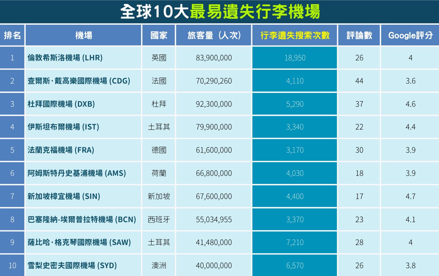 【機場/遺失行李/旅遊保險】根據英國《每日郵報》報導,旅遊平台AirAdvisor研究了全球53個機場,查看了機場的年旅客數量、從登機口的平均距離(以分鐘計)、Google搜尋「丟失行李」、Yelp上的差評以及機場的Google評分﹐公布了2025年「全球10大最易遺失行李機場」,歐洲機場佔了5個、中東1個、歐亞1個,而亞洲區則有1個,佔據榜上頭兩位的更是港人經常使用的機場,即睇邊10個機場最易遺失行李,外遊如使用上述的機場,記得買重旅遊保險啊!