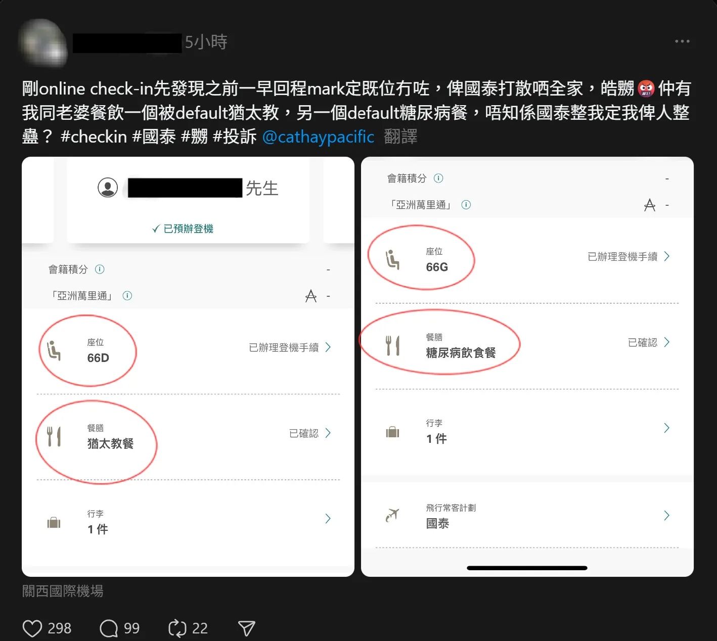 3️⃣ 回程時發現全家座位被分散,餐飲被篡改為猶太餐和糖尿病餐