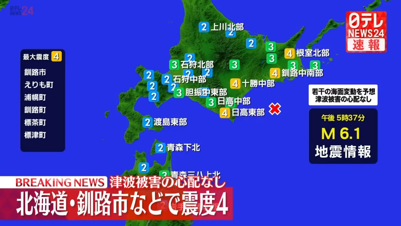 根據氣象廳觀測,今次的6.3規模地震,最大震度4的強烈搖晃發生在在北海道十勝大樹町與浦幌町。震度3的地區則包括釧路、帶廣、厚真町、安平町、鵡川町、平取町、新冠町、浦河町、襟裳町、新日高町、音更町、廣尾町、幕別町等地。