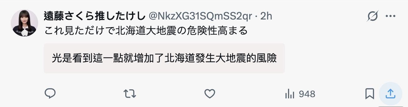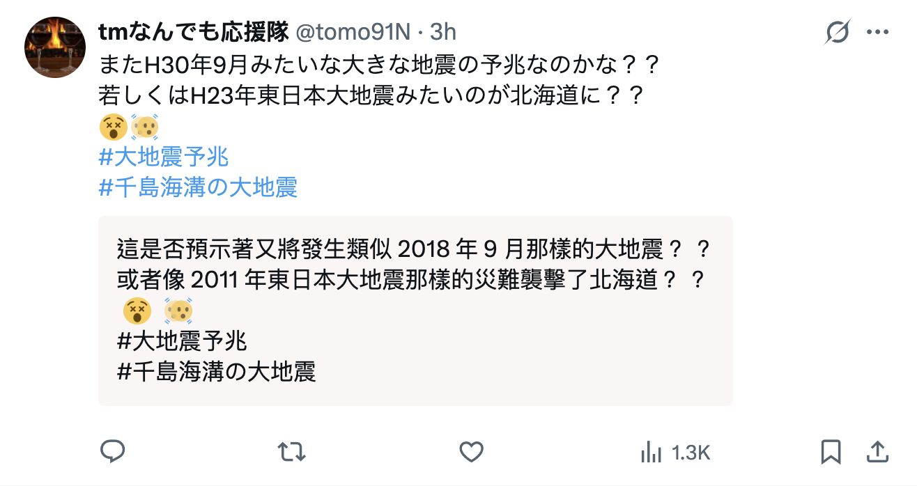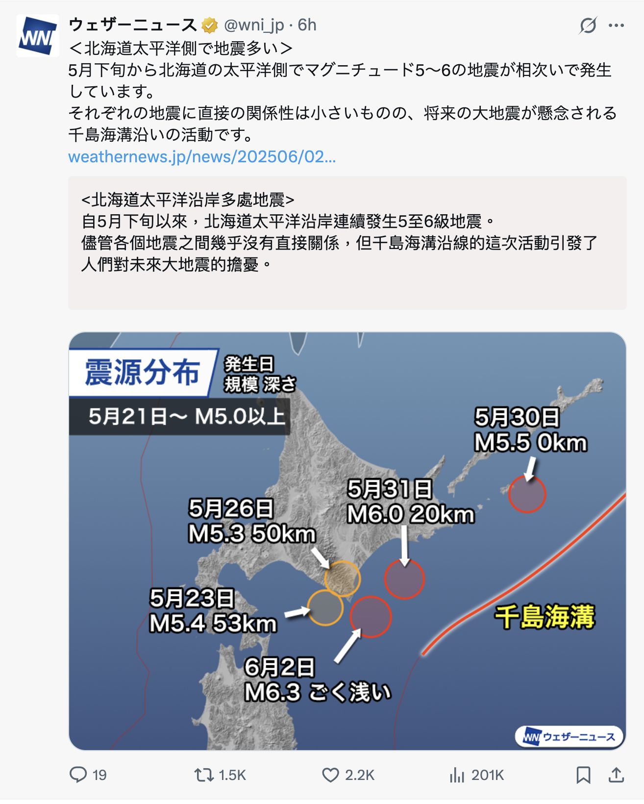 今次發生地震的區域,距離北海道千島溝不遠,根據日本氣象情報社「ウェザーニュース [Weathernews.jp](http://weathernews.jp/)」表示:「自5月下旬以來,北海道太平洋沿岸連續發生5至6級地震。儘管各個地震之間幾乎沒有直接關係,但千島海溝沿線的這次活動引發了人們對未來大地震的擔憂。」從下圖可以看到自5月下旬(5月21日起)11日內,已發生了多次5-6級地震,有網民表示擔心北海道發生大地震的風險急升。
