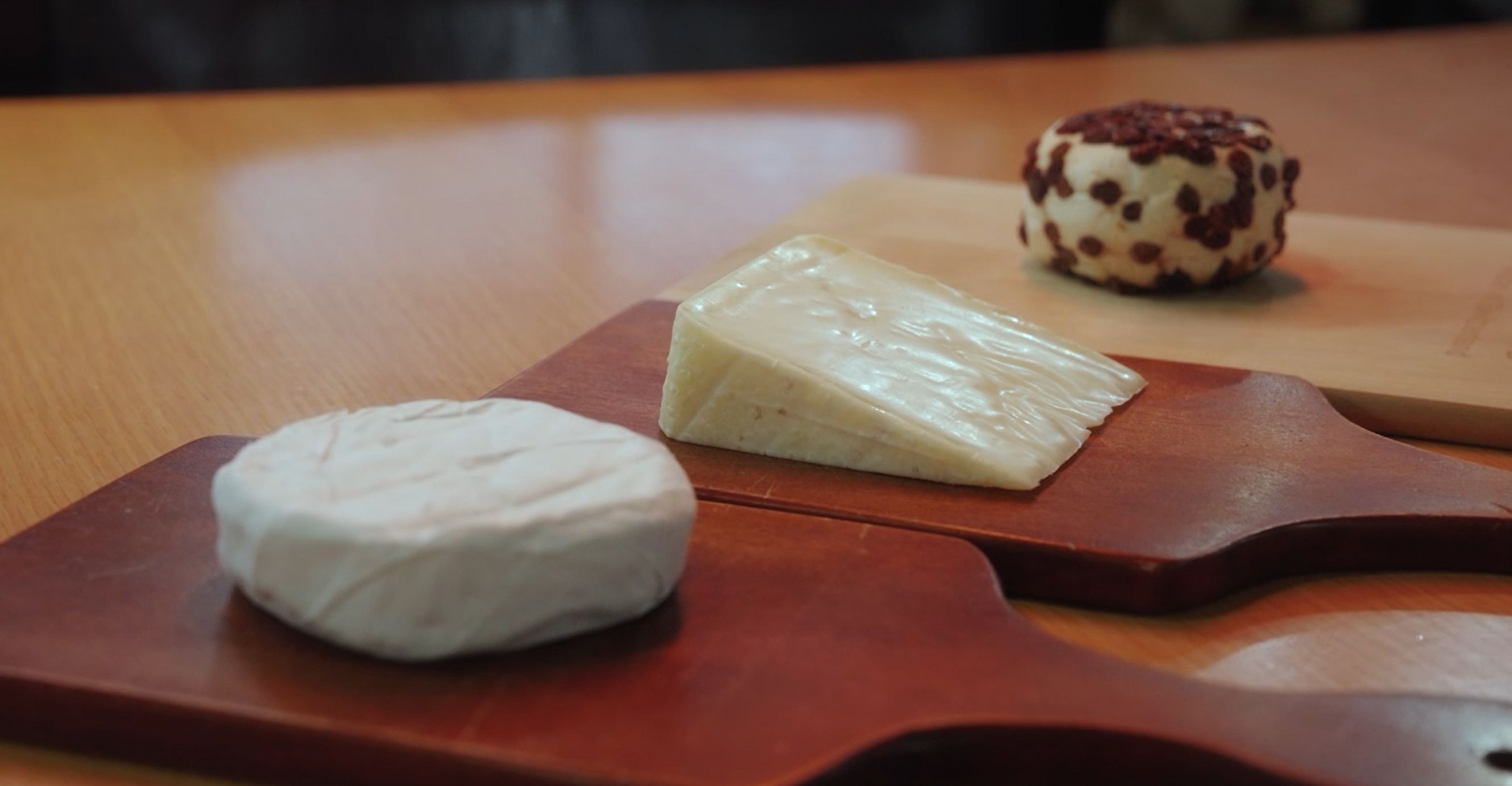 正在發酵、準備脫水的芝士叫Fresh Cheese,即新鮮的芝士,熟成後加入提子乾。Riviere Blanc軟質白黴芝士是工房自家製法做的芝士,味道較淡,軟硬度適中;熱郛芝士是熟成1個月以上的半硬質芝士,味道較濃,有乳酪的味道;新鮮芝士上面有很多汁的提子乾,帶香甜口味,吃起來像慕絲蛋糕。