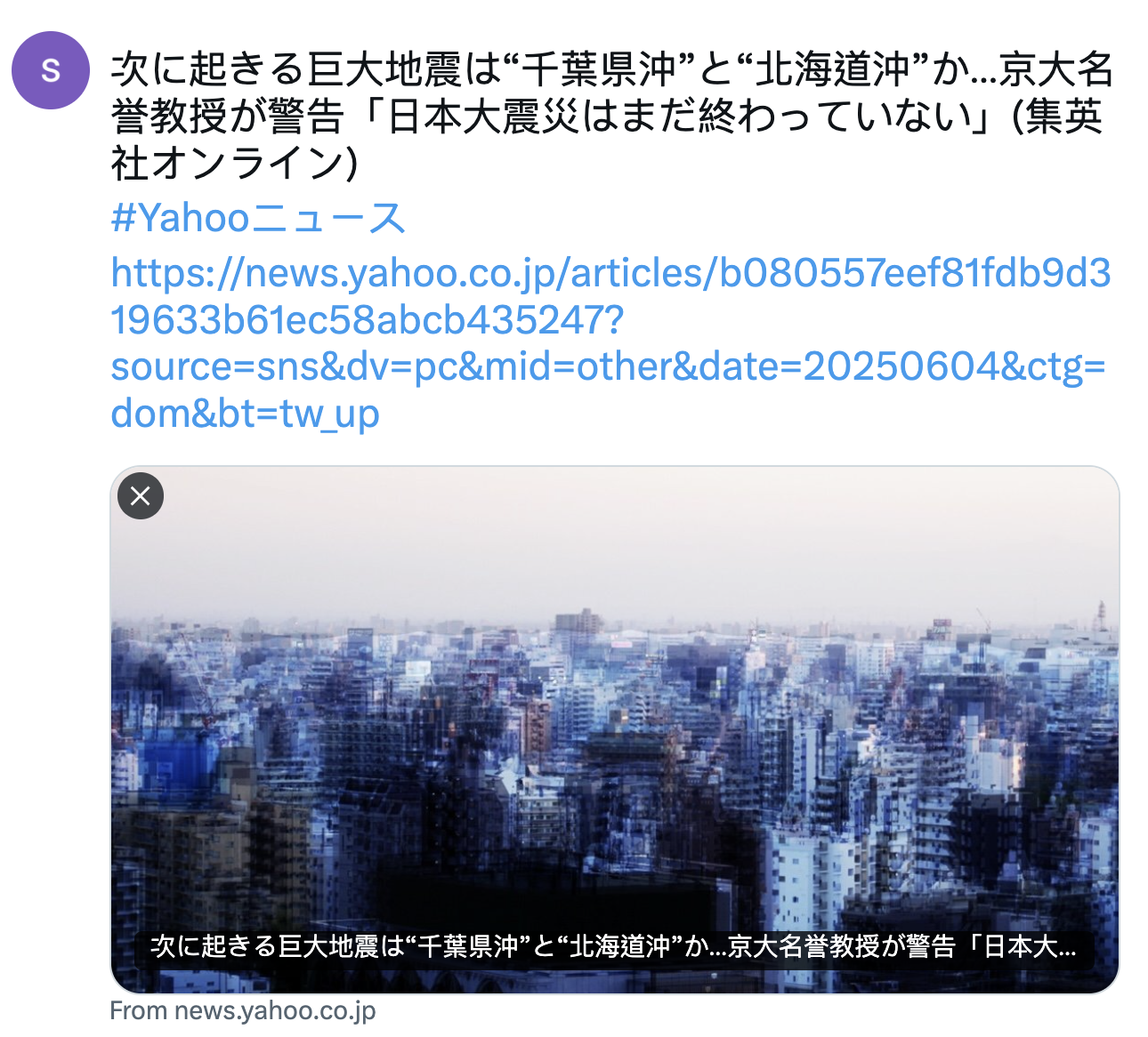 日本著名地球科學學者、京都大學教授鎌田浩毅不時向民眾發出警告,6月2日他在集英社發文,警告日本有兩個地區一樣潛在巨大地震的風險,其中一個區域更與14年前、2011年發生的311大地震有關聯。日本下一次巨大地震可能發生在千葉縣外海或北海道外海。