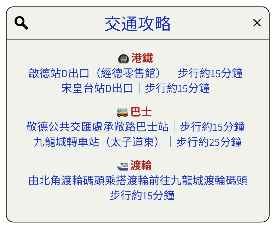 由北角渡輪碼頭乘搭渡輪前往九龍城渡輪碼頭|步行約15分鐘 ![]()