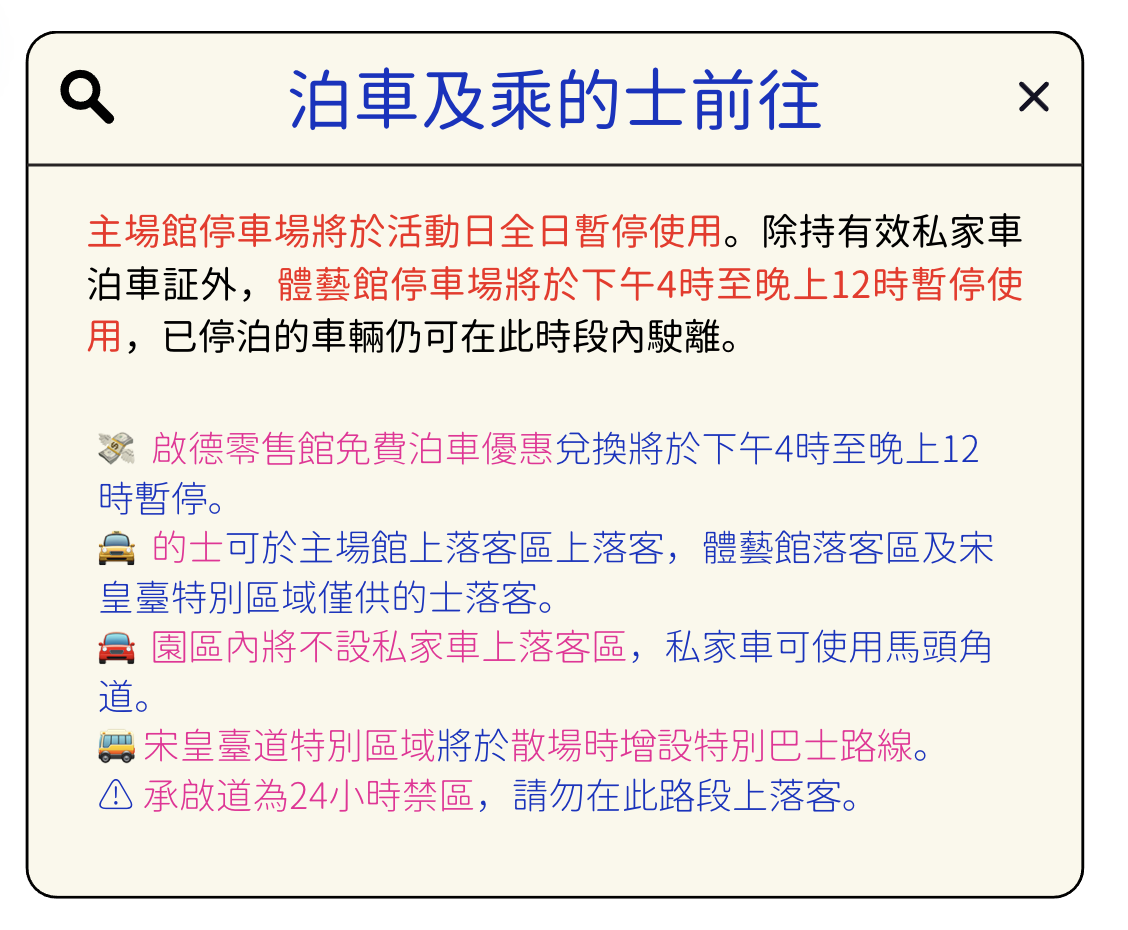 🚖 的士可於主場館上落客區上落客,體藝館落客區及宋皇臺特別區域僅供的士落客。