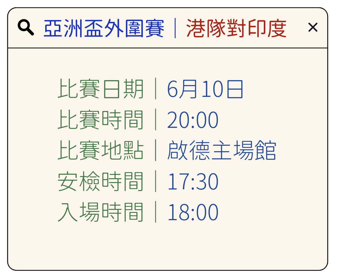 【亞洲盃/港隊對印度/啟德體育園/啟德主場館/啟德體育園入場須知/亞洲盃外圍賽/港足/香港足球總會】香港足球代表隊明日(6月10日)於啟德體育園主場館出戰亞洲盃外圍賽、決戰印度隊,這是港足首次於啟德主場館作賽,目前已售出超過4.5萬張門票。如果你會入場睇港隊對印度,記得留意啟德體育園入場須知,一文話你知入場時間、安檢安排、可攜及不可攜帶的物品,入場規則、背囊手提包大小限制、貯物位置及收費,以及乘搭公共交通工具攻略,跟足指引,睇騷更開心!