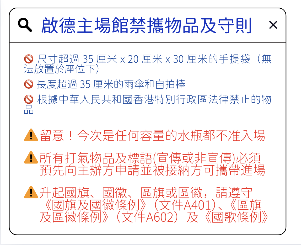🇭🇰 若涉及展示、使用或升起國旗、國徽、區旗或區徽,或進行升旗儀式、奏國歌或唱國歌, 任何使用啟德主場館的人士必須遵守所有適用的法律和法規,包括但不限於《國旗及國徽條例》(文件A401)、《區旗及區徽條例》(文件A602)及《國歌條例》。🇨🇳