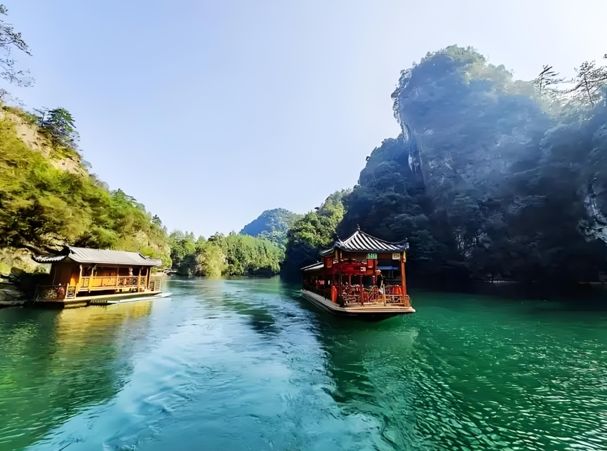 【第 2 日-享酒店早餐、湘西風味午餐、 芙蓉鎮景區晚餐自理)】遊覽「人間瑤池」寶峰湖景區,連遊船體驗;及「國家 4A 級景區」芙蓉鎮高峽平湖。奇峰飛瀑有「飛流直下三千尺」的寶峰飛瀑,是景區的亮點之一登上鷹窩寨,可以俯瞰寶峰湖,感受山水的壯麗。