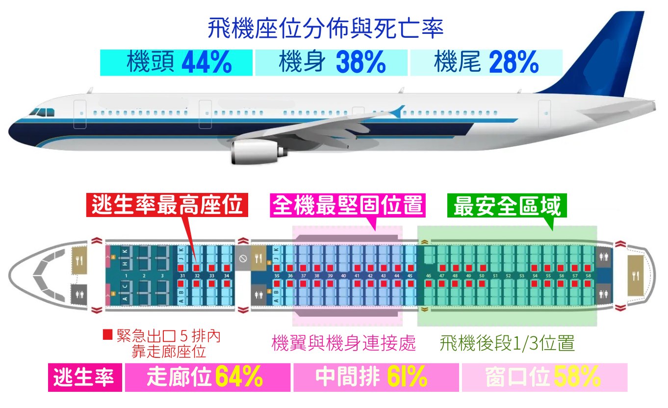 🔸其中後段中間座位死亡率僅 28%,為全機最低。