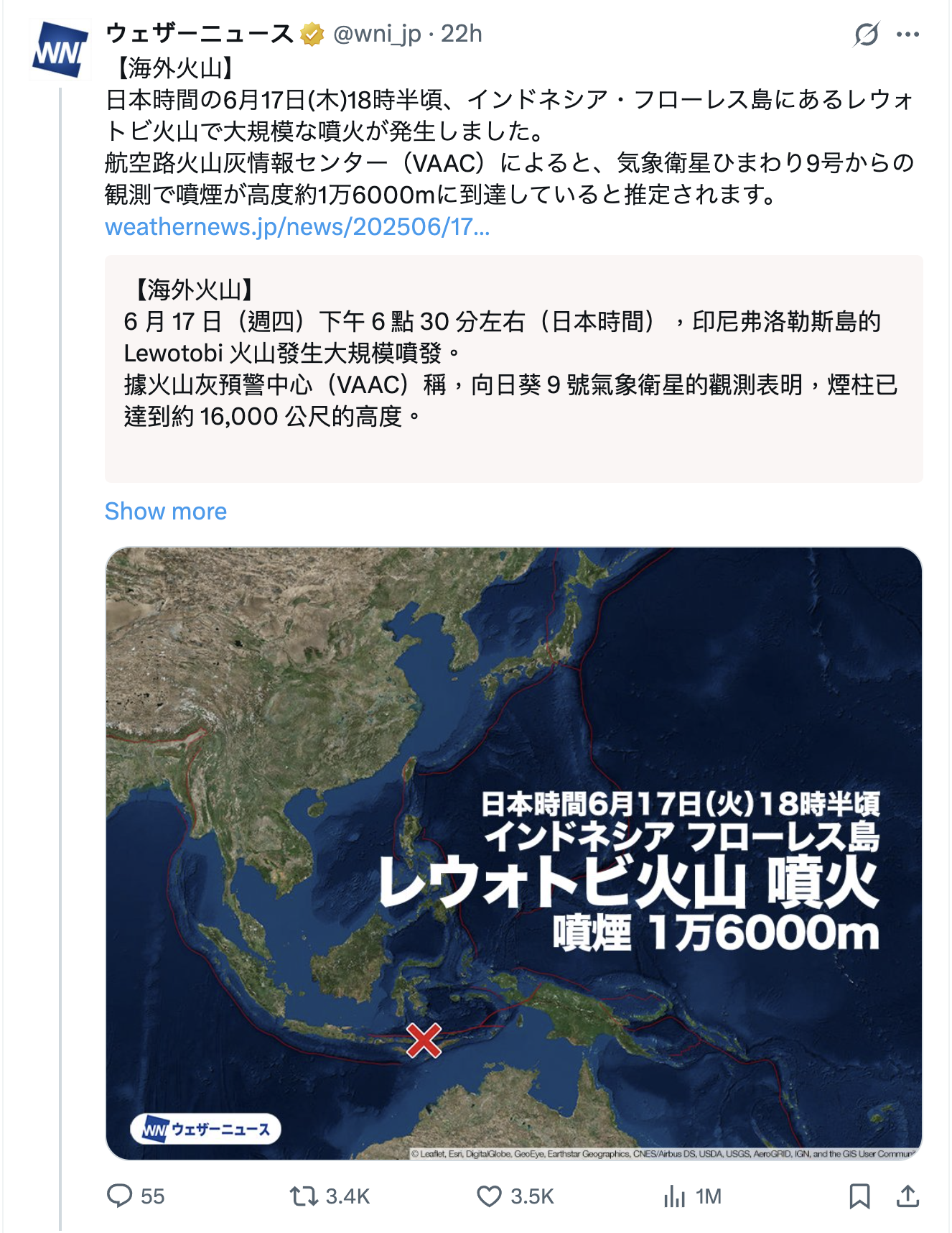 【印尼火山爆發/海嘯/火山爆發/日本氣象廳】根據日本放送協會NHK報導,昨日(6月17日)香港時間5時45分左右印尼東努沙登加拉省的勒沃托比拉基拉基火山(Lewotobi Rakiraki)發生大規模爆發,火山灰柱直衝16000公尺高空,呈現橙紅色的蘑菇雲狀態,而遠在5300公里以外的日本亦可能受到火山爆發所引發的海嘯影響,日本氣象廳表示會持續監察海嘯會否沖擊日本。