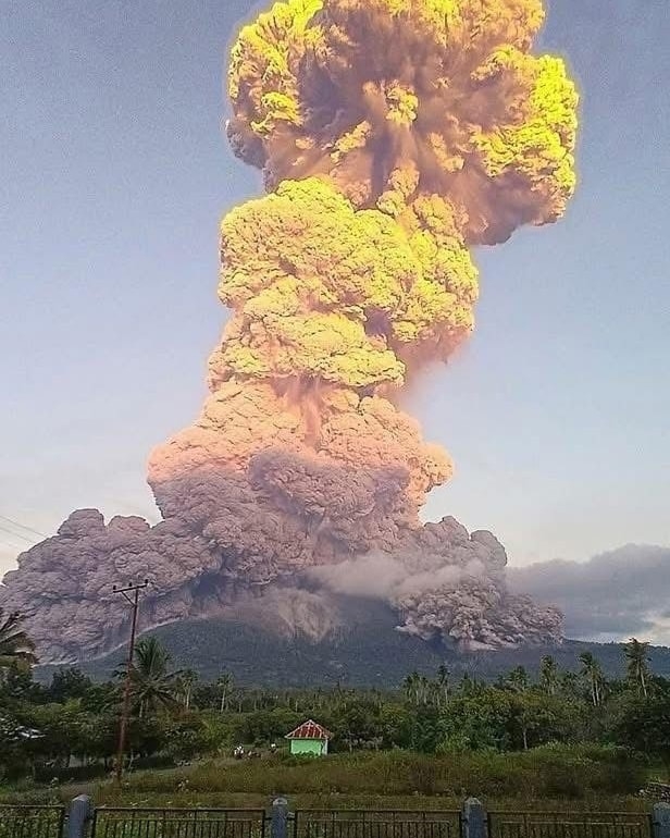 📸 印尼火山機構發布一張相片,可以看到火山爆發後火山灰及煙霧的火山灰柱直衝16000公尺高空,而且呈橙紅色蘑菇雲狀,火山煙霧將附近村落籠罩。