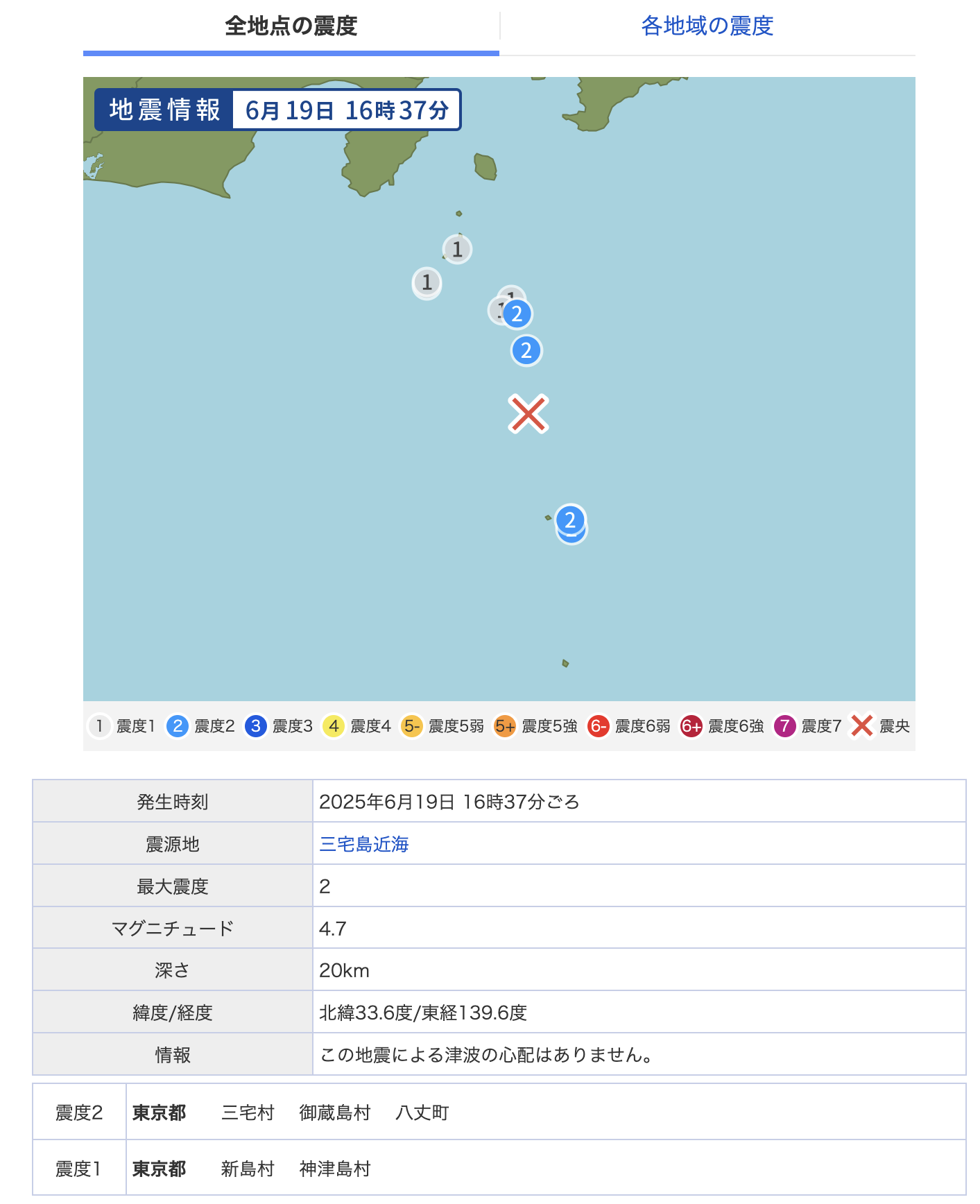 1️⃣ 東京都三宅村、御藏島村和八丈町等地區觀測到最大震度2,神津島村及新島村則測得震度1,沒有引起海嘯,東京都亦有感