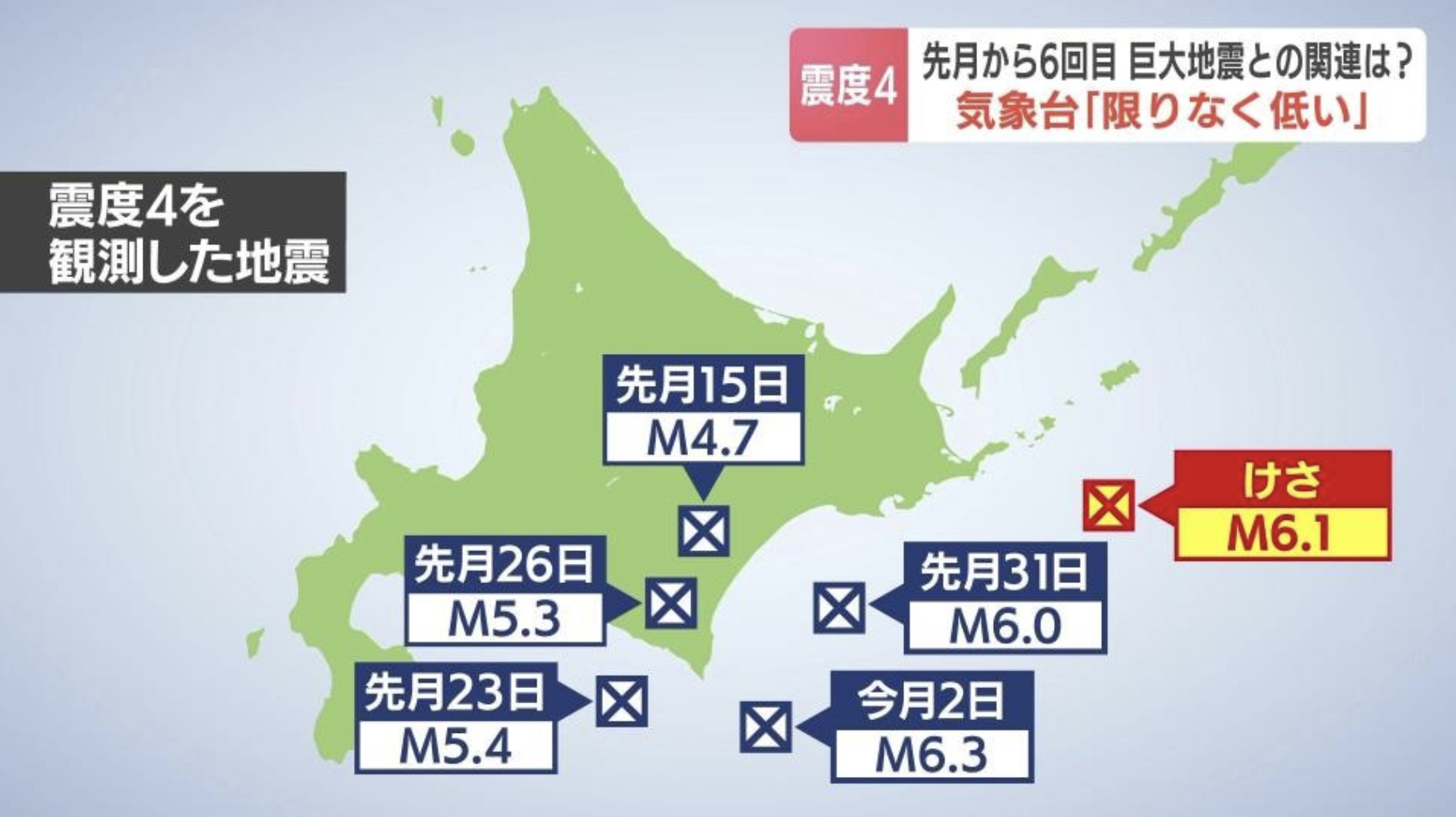 北海道由5月開始至6月上旬,連續發生4次規模4以上的地震,雖然最近3日內地震活動較平靜,但氣象廳持續提醒千島海溝沿岸有可能出現大規模地震。