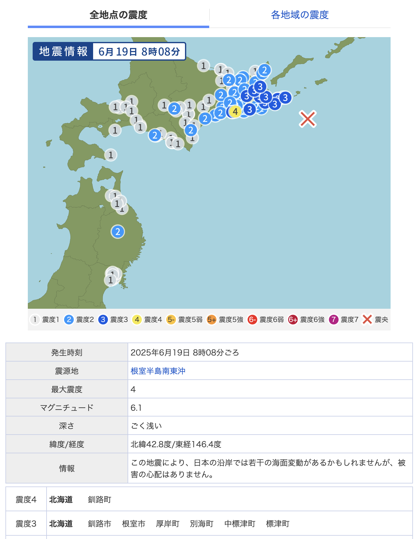 1️⃣ 北海道東部的釧路市、厚岸町、別保町等地均有明顯搖晃感,多處地區都感受到震動,部分地區的民宅物品掉落、列車短暫停駛,未出現重大災情或傷亡。