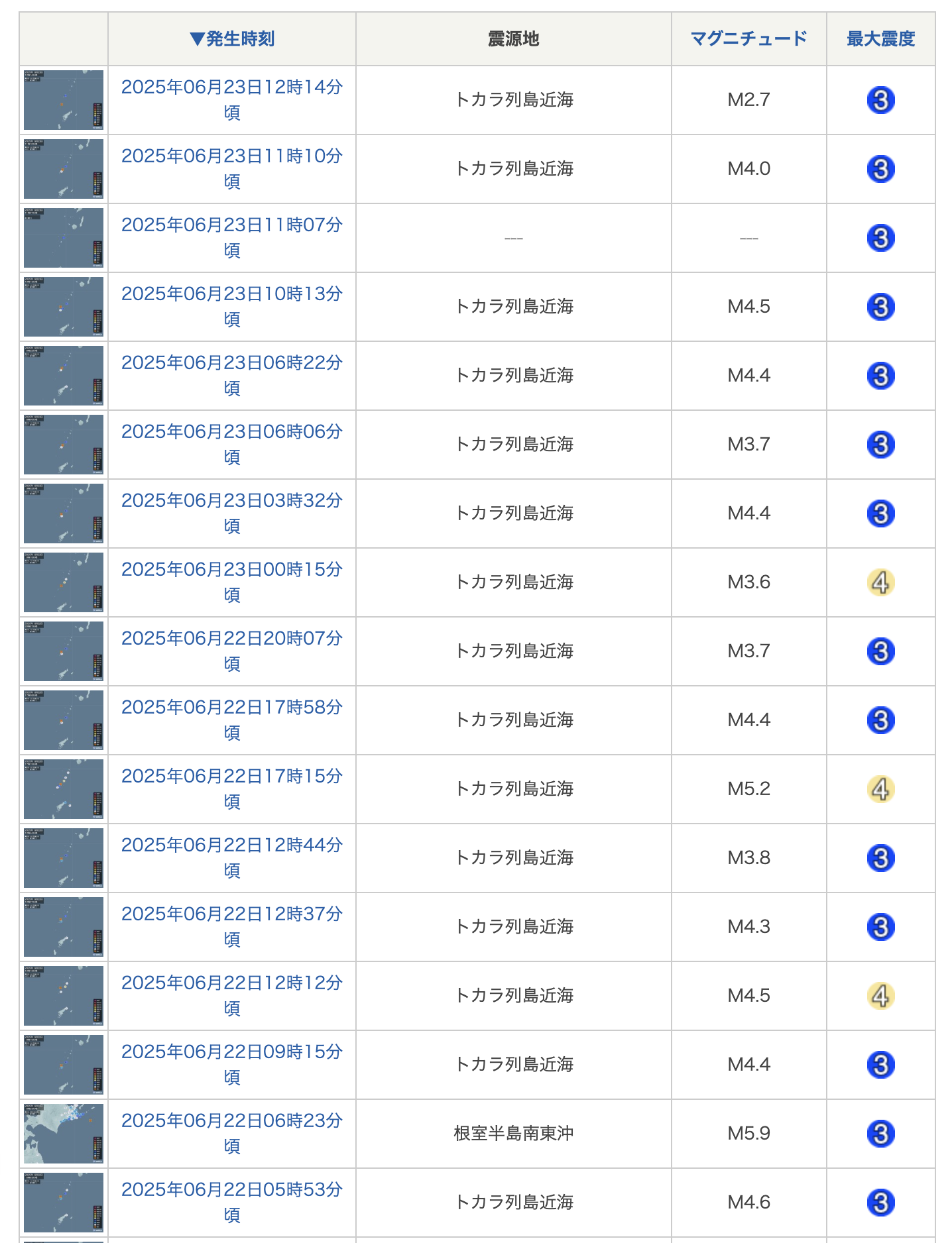 【日本地震/日本南海海槽地震/北海道地震/鹿兒島地震/吐噶喇群島】距離《我所看見之未來》預測的7月5日大災難不足2星期,日本近日地震頻頻,除了自5月下旬北海道頻發規模5以上的地震,6月21日開始狂震,累計至6月24日早上已發生超過300次大大小小的地震,最大規模的達5.2級,日本氣象廳表示未來短期內可能會出現強震。