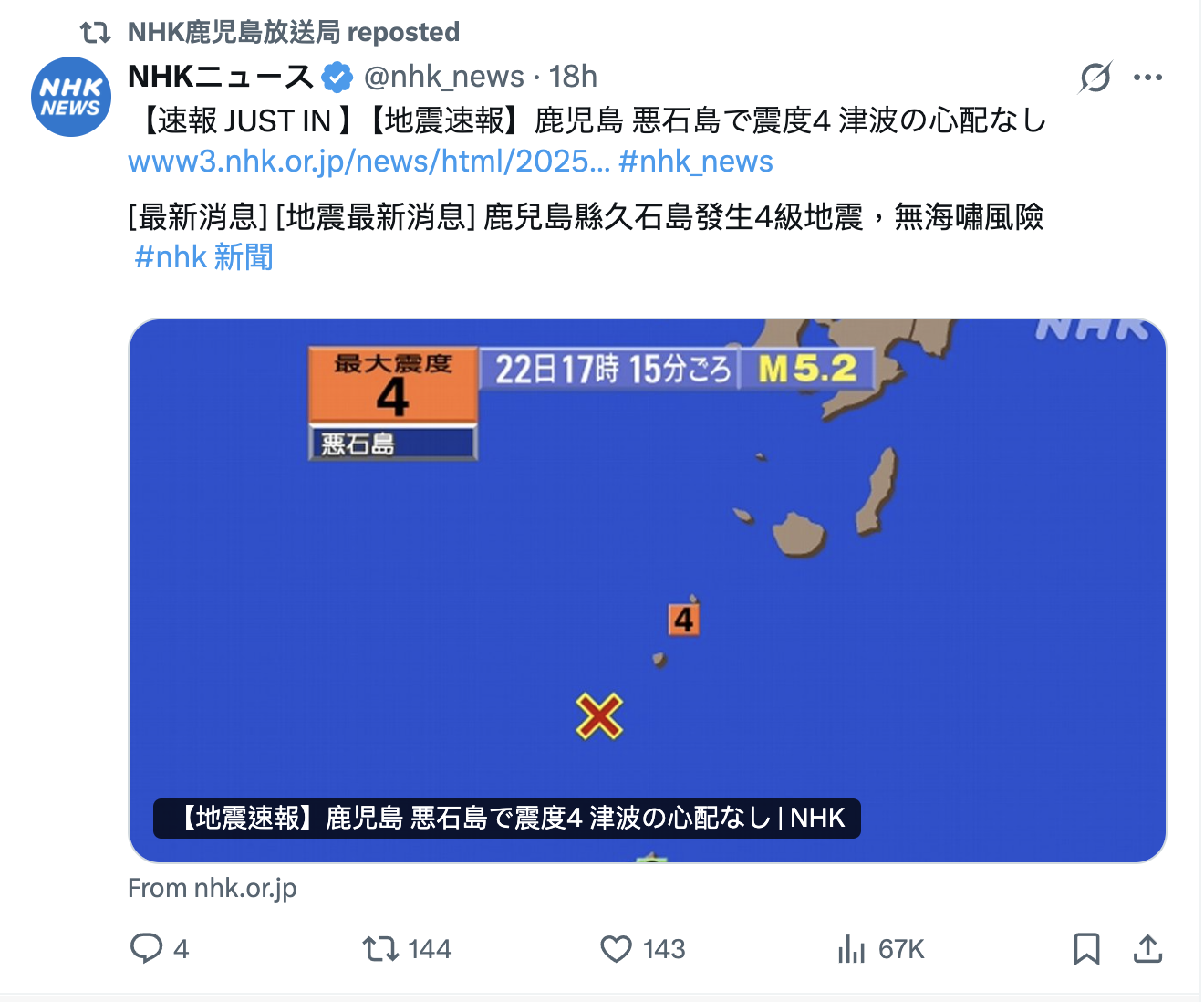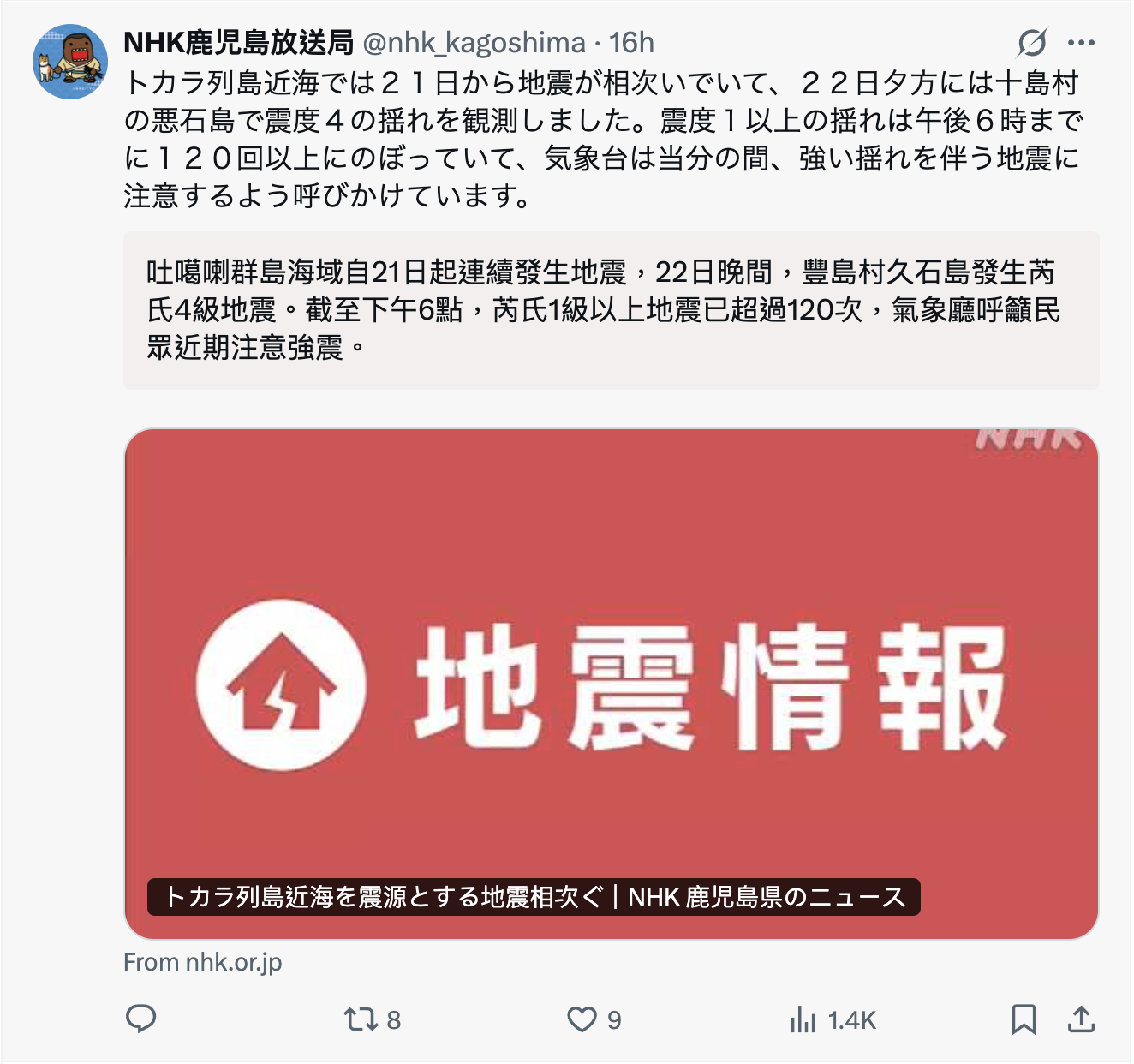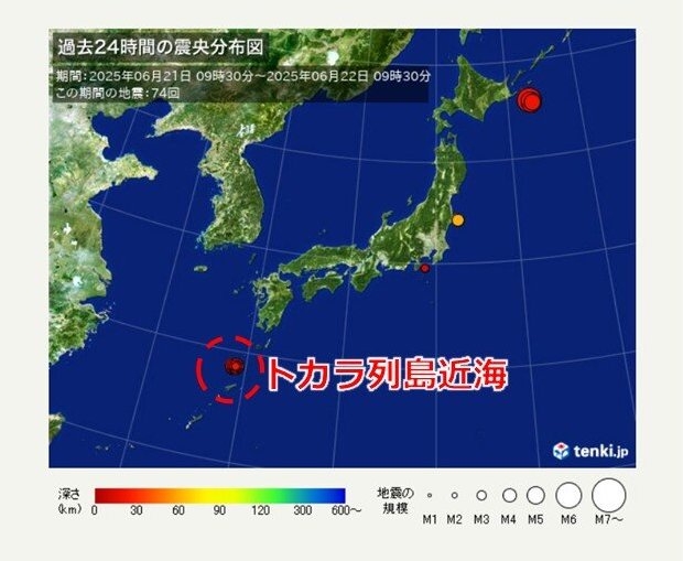 自6月21日起,日本氣象協會今(22)日指出,位於九州以南、琉球群島以北的「吐噶喇群島(トカラ列島)」地震活動顯著增加。