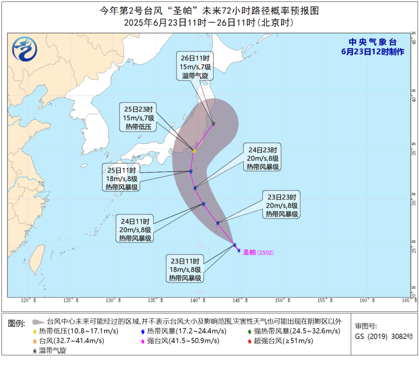 ➤ 位於太平洋的熱帶性低氣壓(TD03)於今(23)日上午8時增強為輕度颱風「聖帕」,預估路徑: