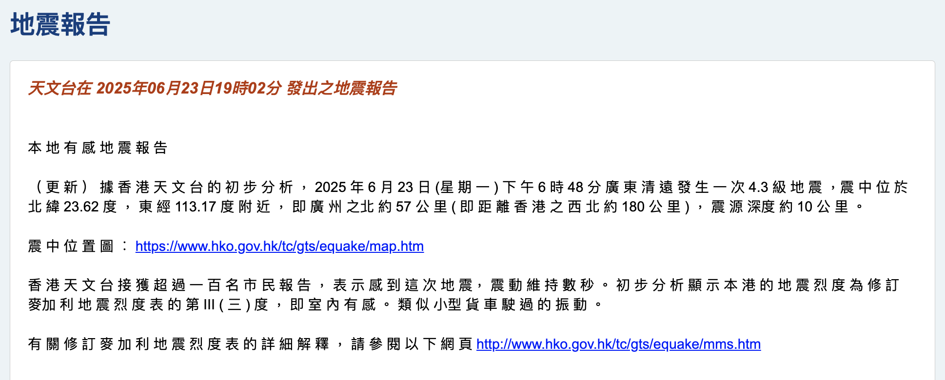 【香港地震/廣東地震/清遠地震/香港天文台】天文台在2025年06月23日19時02分發出之地震報告,初步分析,2025年6月23日(星期一)下午6時48分廣東清遠發生一次4.3級地震,震中位於北緯23.62度,東經113.17度附近,即廣州之北约57公里(即距離香港之西北約180公里),震源深度約10公里。