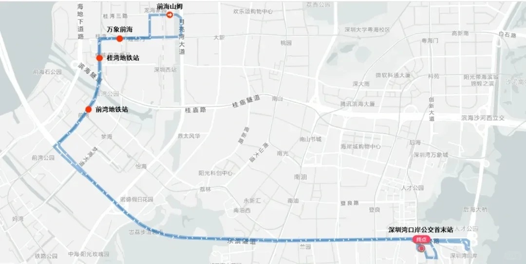 🚏 停靠:前灣 / 桂灣地鐵站、前海山姆(6.29 開業)(🔄 可換乘 B990 線到前海石公園看海景~