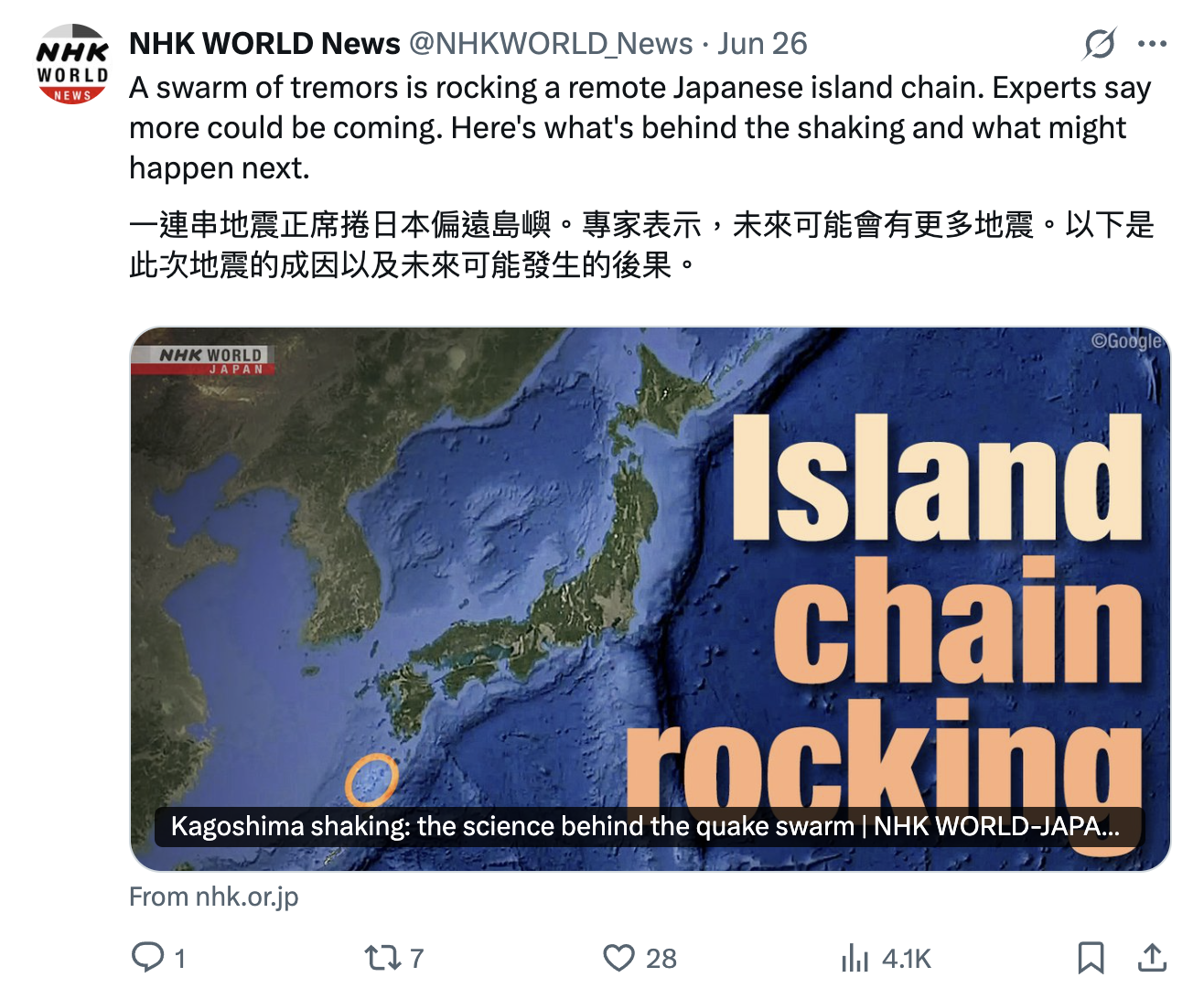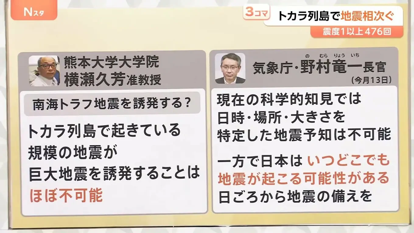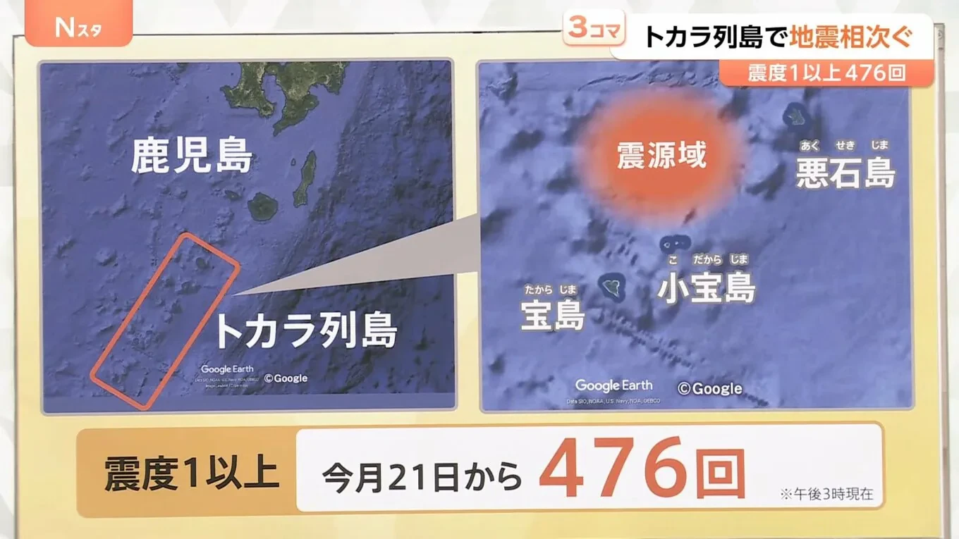 【日本地震/日本地震危機/鹿兒島地震/吐噶喇群島地震/日本南海海槽大地震】距離《我所看見之未來》預測的7月5日大災難只有一星期,日本當地地震頻頻,其中備受關注的有鹿兒島吐噶喇群島高頻率地震。綜合日媒NHK(日本放送協會)及TBS News報導,自上周六(6月21日)起,日本西南部鹿兒島縣的偏遠島鏈吐噶喇群島已累積地震近500次,有日本地震專家分析這情況恐會發生6級地震,亦分析吐噶喇群島頻密地震會否觸發備受關注的日本南海海槽大地震呢?